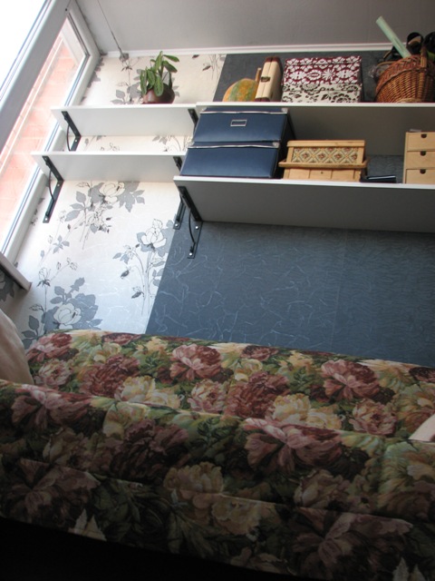 Это обои под подоконником. С ними вообще отдельная история. Изначально я думала другое оформление лоджии, другие цвета и вообще - все по-другому. Но! Когда я увидела эти обои, у меня в голове сразу сложился образ нашей будущей лоджии, вместе с полками, цветом пола и остальным. Так что - можно представлять себе одно, а потом резко передумать и сделать по-другому :rolleyes: