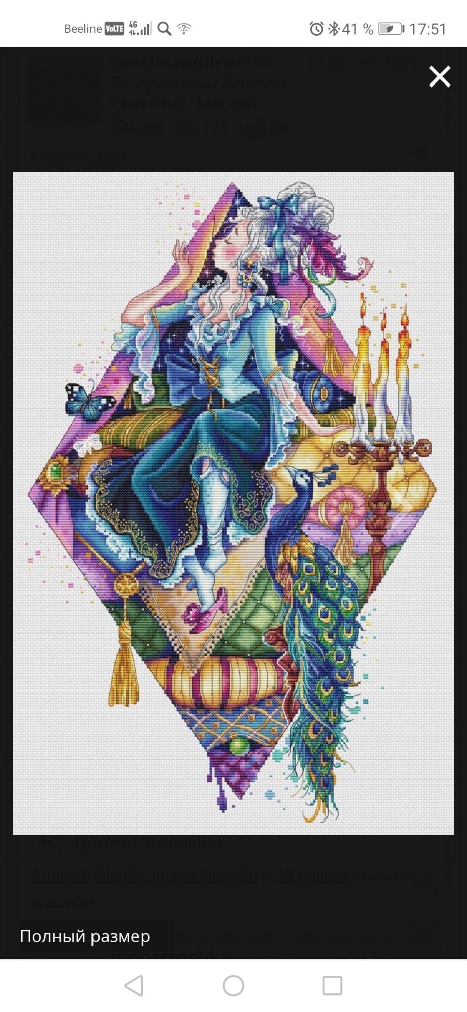 19 сентября Очень красивый дизайн, нежный! Ниточки вели себя замечательно! Потрясающая цветовая гамма! Восторг! Даже в процессе не хотелось начинать новое, пока не дошила это... Palex, nogres, relax_cross_stitch и 3 других сказали спасибо Поделиться сообщением Ссылка на сообщение