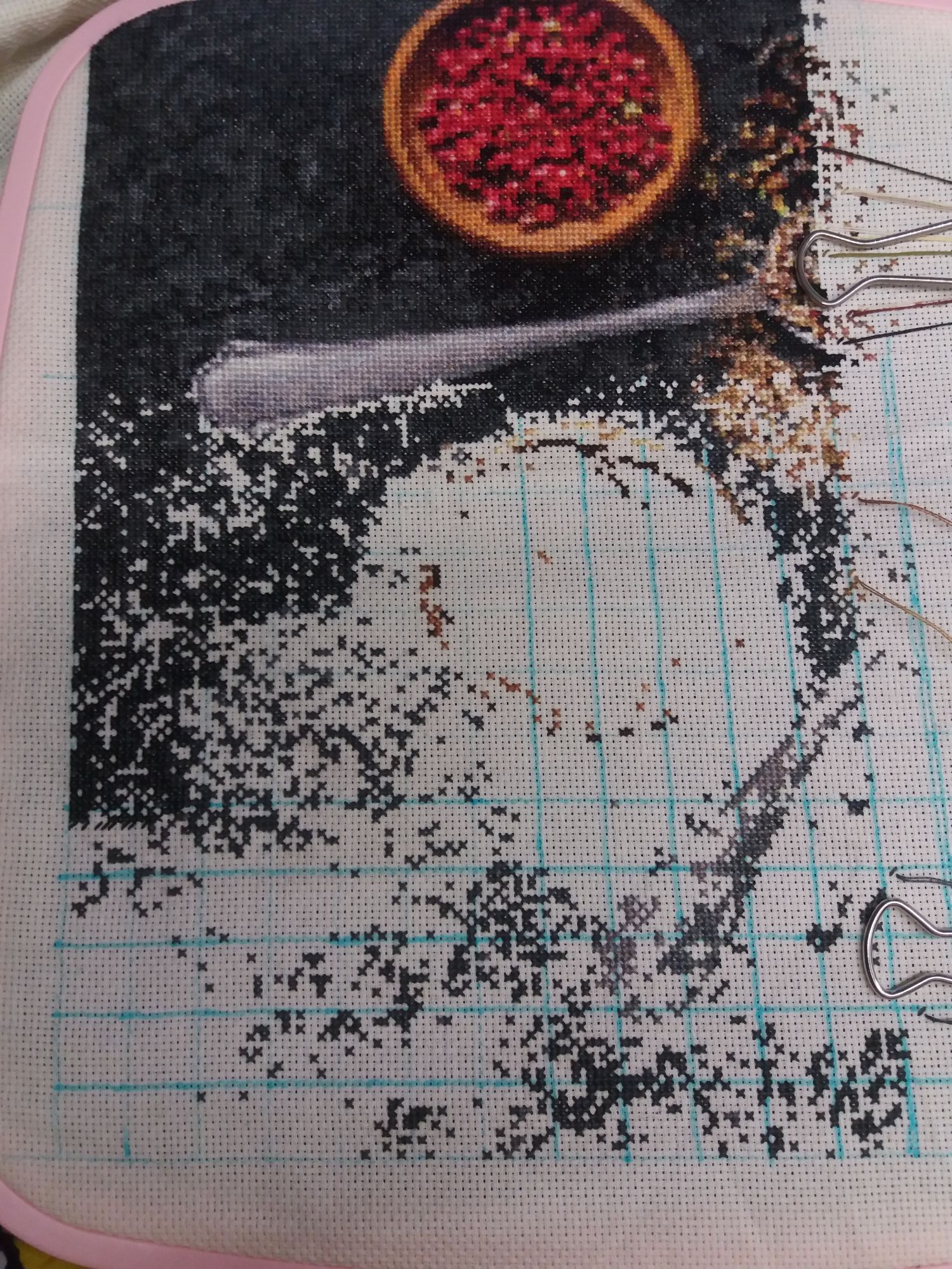 29 марта 2023 "Специи". Процесс. Третий фрагмент. Скорость отшива очень разная. Дневной максимум был 1504 крестика (это большой цвет фона), минимум 59 (но связано с ограничением по времени). В сложных участках удается за 4 часа отшить 300+ крестиков. А сейчас как раз россыпь в сюжете и россыпь в схеме. Фон уже зашит, начала отшивать символы из ручки ложечки. nata2017, Полли, Lenara и 28 других сказали спасибо Поделиться сообщением Ссылка на сообщение