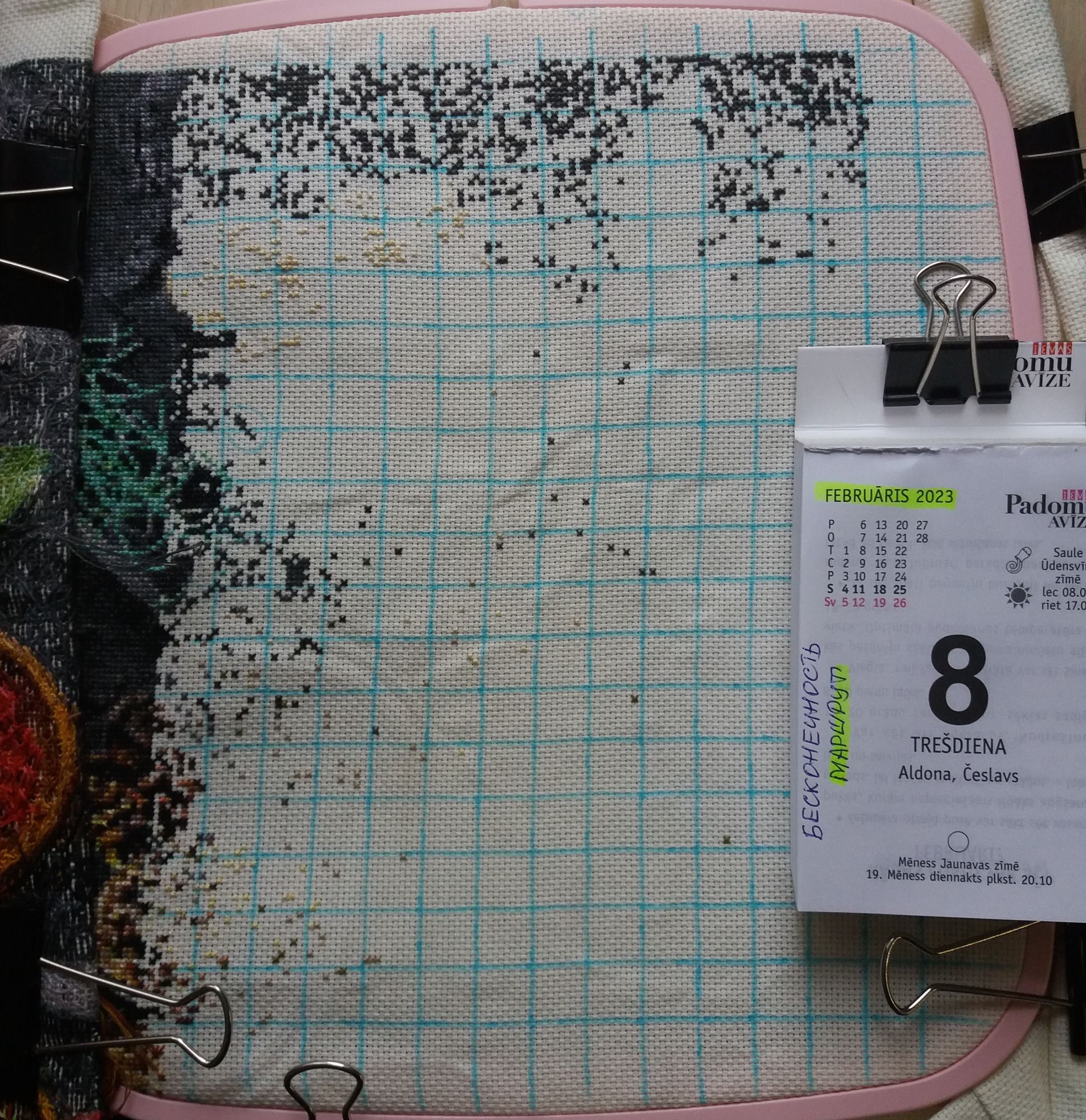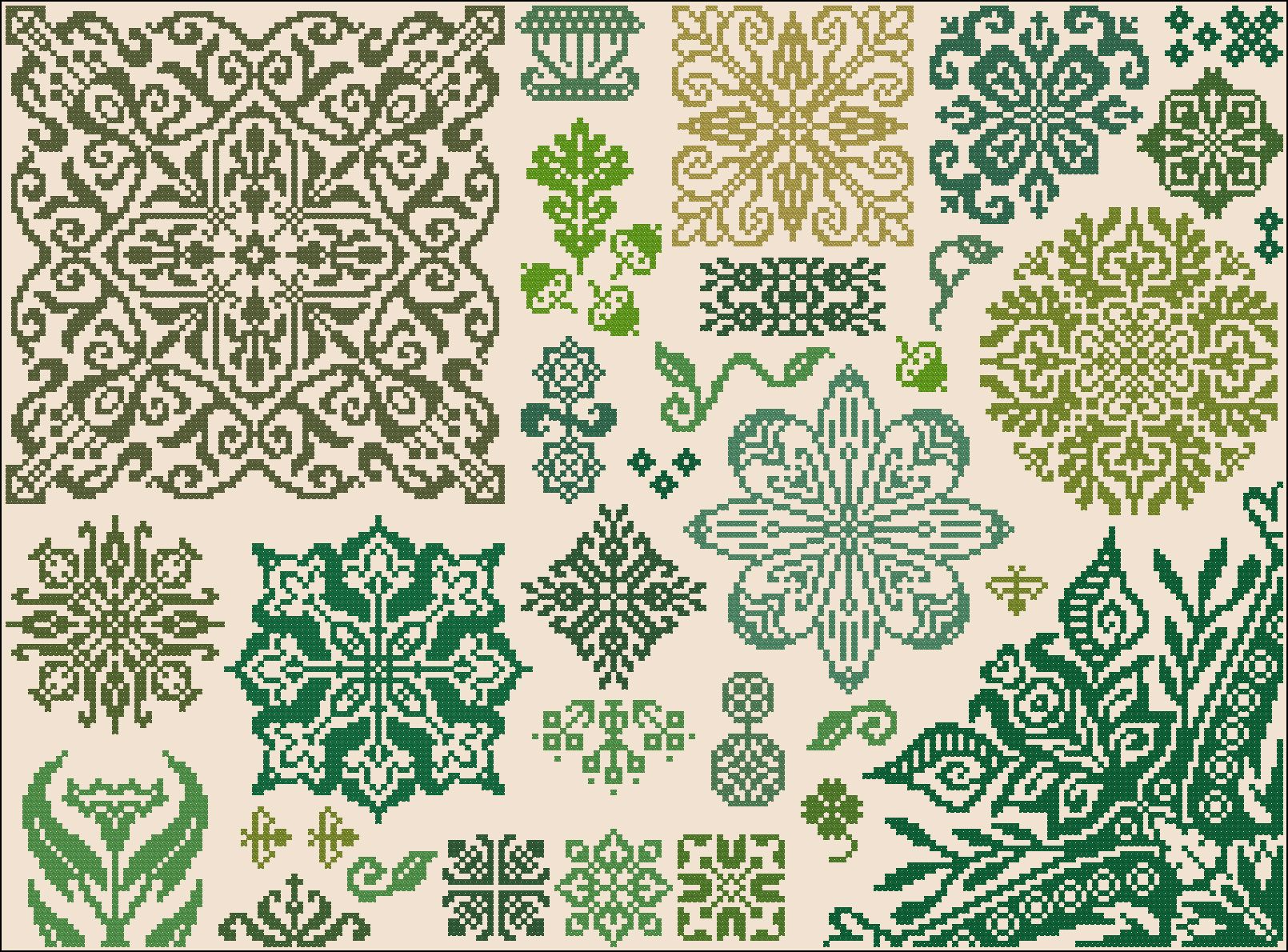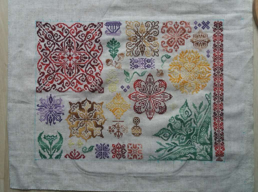 28 марта 2023 "Семплер" по мотивам Inc Cirkles Размер 29 на 39 сантиметров. Всего 15 815 крестиков. Мулине меланж 8 оттенков. Начат 10 марта, завершен 27 марта. До завершения текущего процесса с момента открытия "Полянки" оставалось примерно 600 крестиков. Так что решила закончить и показать уже в комплекте, так сказать. Всегда очень нравились разные семплеры, от "Кругов", "Треугольников" и остальных фигур "ИнкСёркла" по сей день оторваться не могу. Но как-то в отшив они ко мне не приходили. А тут подвернулся случай. Оформила "Феньку", повесила на стенку, и там образовалось место, куда отлично добавился бы отрывной календарь на подложке. И так, дано: готовая фоторамка, кусок канвы в стиле рустик (цвета мешковины, такой мне приемлем под неполный зашив), стародавние моточки мулине меланж (еще советские, где один, где кучка) и разбойничий подход к добыче схемы. Понятное дело, что под нужные см готовой схемы не нашлось. Но семплер дело такое, что его можно скомпилировать и самой (здоровья рукам разработчиков ПМ!). Цвета распределять не стала, мне главное было в заданный размер заложить отдельные элементы. Да, одним цветом было бы гораздо элегантнее. но что имеем, то имеем. Сложила орнаменты, а уже цвета выбирала по ходу действа. Остается постирать, отутюжить, собраться духом и натянуть. Ах, и еще у китайцев надо заказать медный крючок! АлёNка, sta.nsk, Lenara и 33 других сказали спасибо Поделиться сообщением Ссылка на сообщение