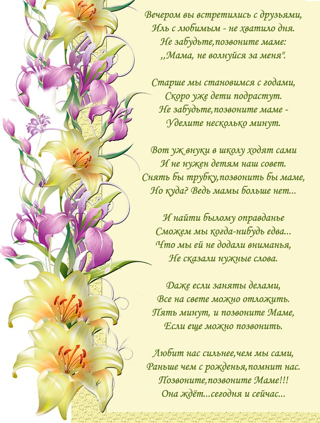 16 декабря 2014 Уже на 3ем 4стишье слезы на глазах.... Юлия Вихарева За первый вздох – быть может, трудный самый! За первый взгляд и первый жизни час Благодарите маму - вашу маму, Что больше всех заботилась о вас. За ваш покой, залеченные раны, За каждый мудрый жизненный совет, Благодарите маму – вашу маму, Что защищала вас от разных бед. За то, что в дом к ней, как к святому храму, Идёте вы на исповедь души, Благодарите маму – вашу маму, Что вас всегда утешить поспешит. Найдите время, измените планы - То не составит страшного труда! Благодарите маму – вашу маму Хотя бы вскользь. Хотя бы иногда… Пишите письма, шлите телеграммы, Пускай коряво, глупо, без прикрас, Благодарите маму – вашу маму, Пока не поздно! Сделайте сейчас… Хельга, Лена1973, Vika71 и 5 других сказали спасибо Поделиться сообщением Ссылка на сообщение