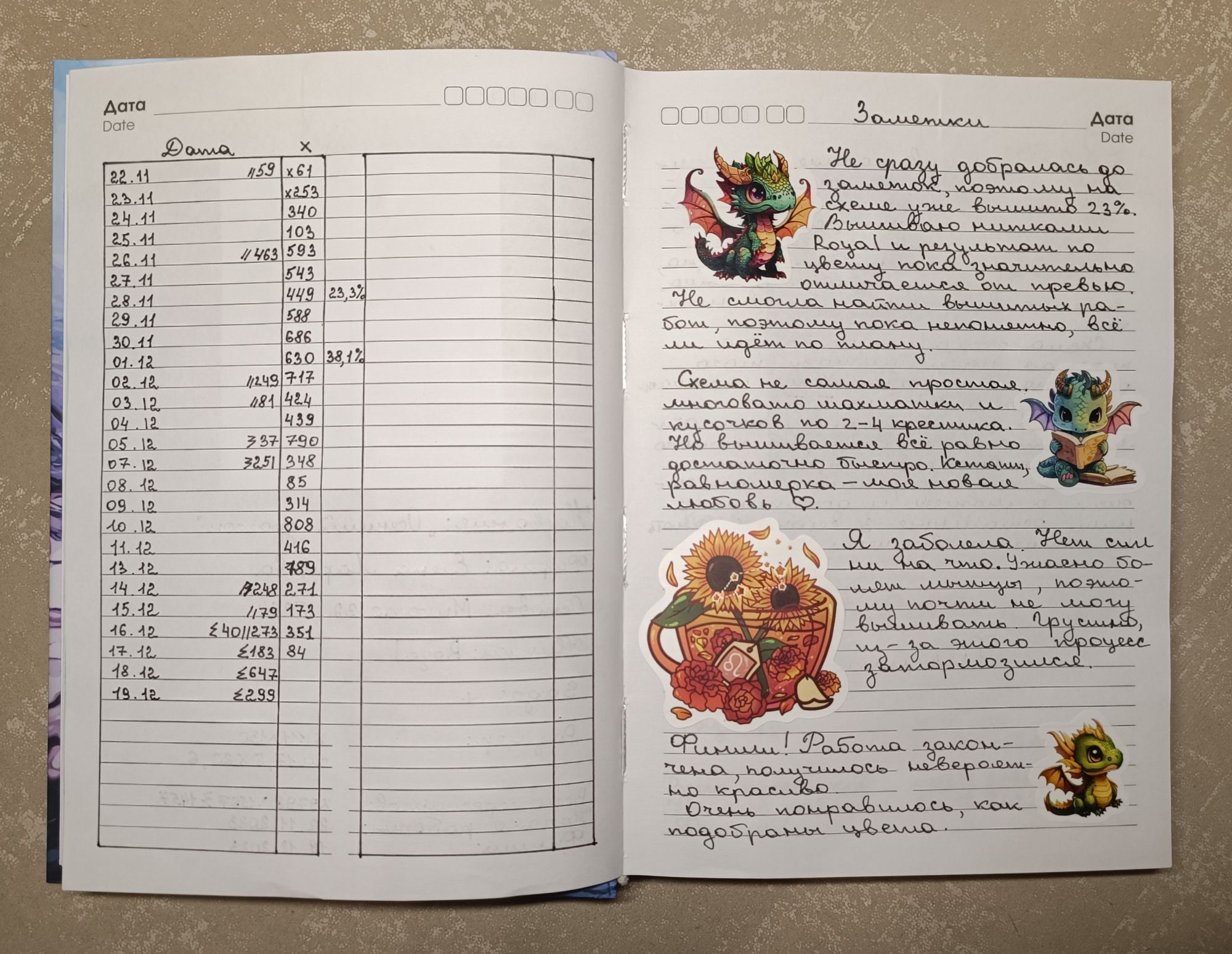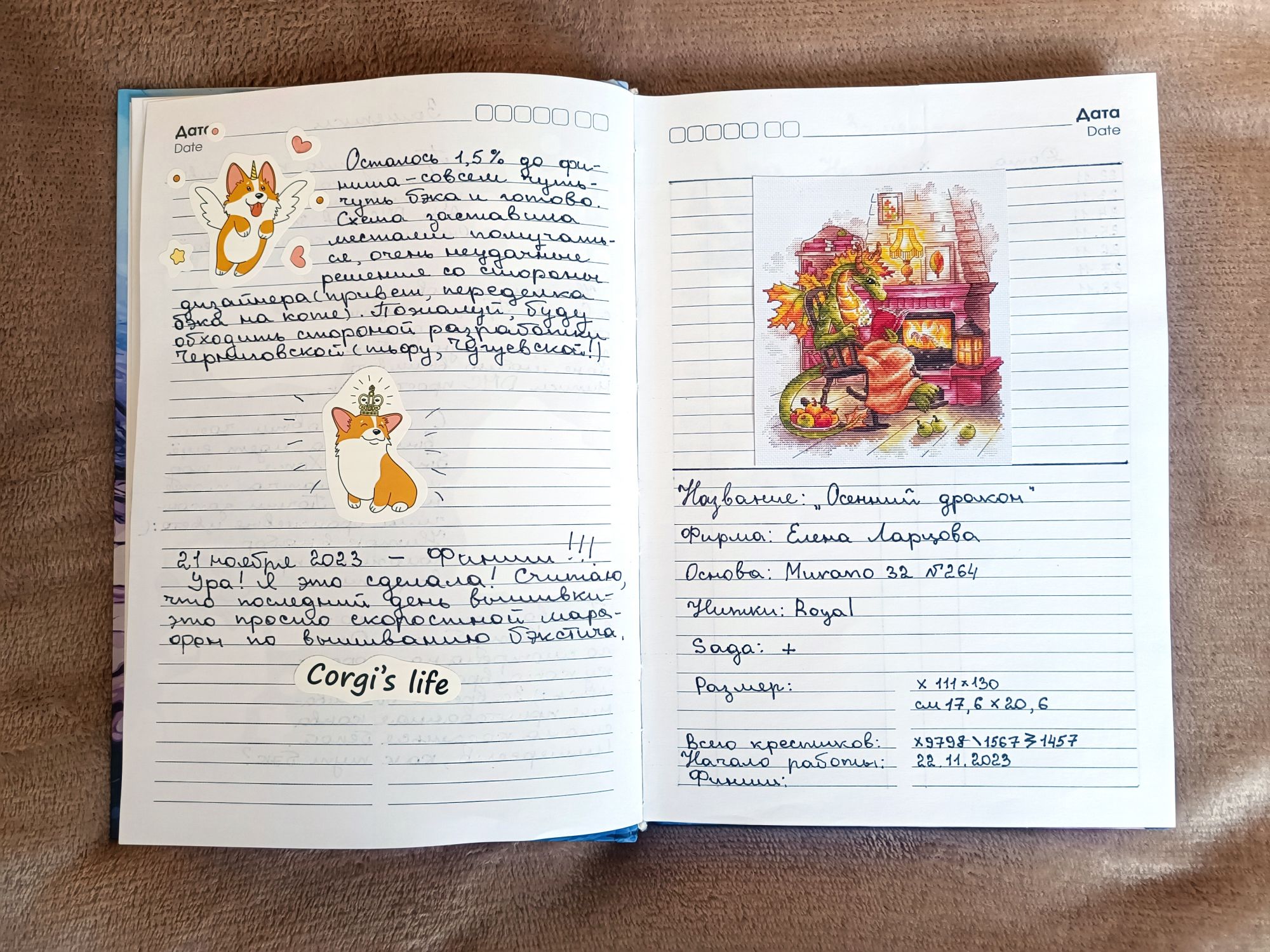 1 декабря 2023 Ещё раз поздравляю с завершением "Корги, кот и облепиховый полёт"! . Канва хорошо подошла к этому дизайну. 29.11.2023 в 07:30, LinaKain сказал(а): И, напоследок, делюсь страничками дневника по этому процессу. Тысячи сердечек этим страницам . Теперь глядя на тебя, хочется тоже добавить своих эмоции/впечатлений в вышивальном блокноте. 29.11.2023 в 07:30, LinaKain сказал(а): Немного волнуюсь на счёт результата, т. к. пледик получается оранжевым, а на схеме в Саге он скорее бежевый. Не смогла найти готовых отшивов по этой схеме поэтому непонятно, это Роял так чудит или так и должно быть. Я из-за таких ситуаций задумалась о покупке карты цветов ДМС. Полезная вещь для тех кто шьет аналогами ДМС. 10 часов назад, LinaKain сказал(а): Девочки, большое спасибо за добрые слова. Вчера дошла до врача и получила по первое число за свою самодеятельность. Заставил сесть на больничный и лечиться нормально, поставили подозрение на пневмонию. Выздоравливай! Здоровья тебе и сил. LinaKain сказал(а) спасибо Поделиться сообщением Ссылка на сообщение