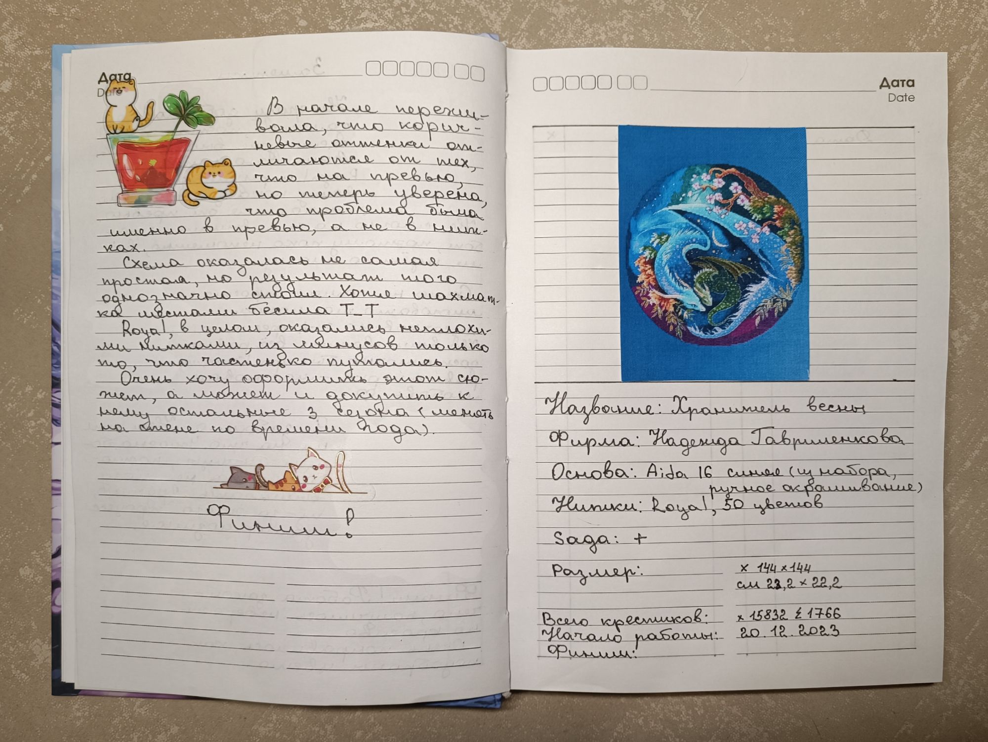 25 декабря 2023 Здравствуйте всем и прошу прощения за долгое отсутствие! Долго болела и была вообще не в состоянии что-то писать, да и вышивалось не особо. Зато сегодня, с новыми силами (и новыми процессами) я вернулась Процесс "Осенний дракон" Финиш (позелените гаечку, пожалуйста) Процесс занял 26 вышивальных дней, в работе использовалось 35 цветов, без блендов, вышивала нитками Royal. Очень понравился итоговый результат, не смотря на все мои переживания, связанные с отшивом неоригинальными мулине. Сейчас это кандидат номер 1 на оформление, очень хочу его видеть на стене. Даже задумалась над тем, чтобы прикупить к нему остальные 3 сезона и менять по времени года. Схема Елены Ларцовой оказалась не самой простой, местами была прям шахматка-шахматка, нужно было перескакивать цветом то тут, то там, но это оправданно. Единственный вопрос у меня возник к бэку белым цветом, так как местами его просто не видно. Пренебрегла ключом и в некоторых местах вышивала его в две нити. Ну и, традиционно, показываю странички дневника по процессу. Новый процесс "Дракон - Хранитель весны" Гавриленкова Надежда #36591 Размер 140х140 крестиков, 50 цветов + 13 блендов из них 10,5% Набор, как и прошлый, от магазина MyBobbin, так же на нитках Royal. Из 4х имеющихся у меня в хомячьих запасах наборов от Надежды Гавриленковой, этот наименее любимый и самый маленький, поэтому пробу было решено начать с него. Никогда не вышивала разработки данного дизайнера, поэтому по факту станет понятно, сколько сил потребуют следующие процессы и когда за них браться. Начало процесса немного омрачил тот факт, что на органайзере отсутствовали 2 цвета из 50, пришлось писать производителю, обещали выслать почтой. Учитывая, что впереди новогодние праздники, а живу я у чёрта на куличках, доставят их, как я думаю, не раньше середины января, поэтому придётся откладывать его и, не завершая, начинать другой. Хвастушки Я всё ещё в завязке с покупкой новых наборов, но, т. к. от прошлого набора осталось достаточно много ниток Royal, я сделала себе подарок и купила прекрасный деревянный ящичек для хранения DMC и его аналогов. Ящик от моих любимых Woodlers, от них же покупала себе и бабушке рукодельные подносики. Такой ящичек для меня - оптимальный вариант хранения ниток, так как не нужно никаких бобинок, никаких наклеек - всё уже подписано, бери и развешивай. Вот, кстати, и рукодельный подносик - в него входит шкатулка, мусорничка и магнитная игольница. Все крышки на магнитах, что, на мой взгляд, очень удобно. В шкатулке храню актуальные баночки с иглами на процесс (у меня сейчас все иглы в таких баночках), нитевдеватель и ножницы. Предновогоднее Думаю, что в следующий раз появлюсь здесь с отчётом уже после Нового Года, поэтому хочу всех заранее поздравить с наступающим, пожелать сил и желания жить, творить, делать, достигать, любить и радоваться. Желаю крепкого здоровья, финансового благополучия, близких людей рядом, уюта и тепла семейного очага. Ну и, конечно, шустрой иголочки и ровных крестиков! Крепко обнимаю всех прочитавших! Nadinka-Blondinka, natalikondr, LadyL и 5 других сказали спасибо Поделиться сообщением Ссылка на сообщение