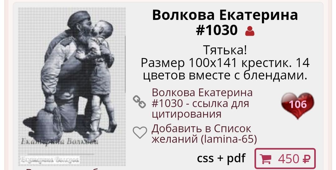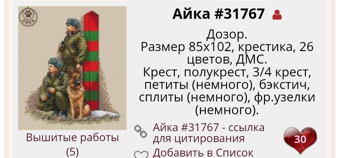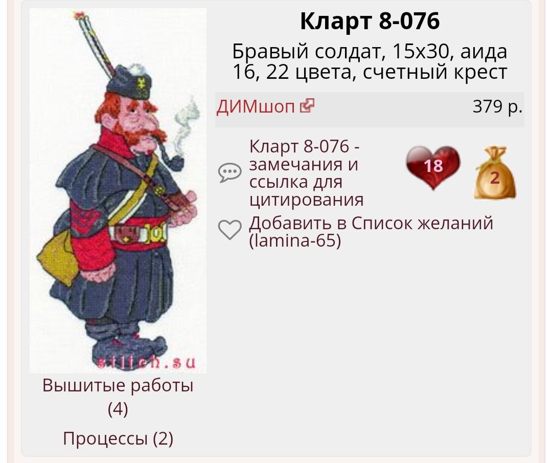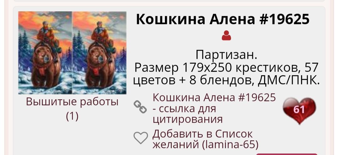 21 марта 2024 20.02.2024 в 15:51, lamina-65 сказал(а): ФОТОЗАГАДКИ Ниже даны фрагменты наборов/схем для вышивки. Вам нужно угадать, что за дизайн и отправить мне в личные сообщения. Всё искать нужно на этом сайте в каталоге. 1. 2. 3. 4. 5. 6. 7. 8. 9. 10. 11. 12. 13. 14. 15. Срок выполнения: до конца месяца За каждый пункт ответа вам приносит 1 балл Ответы на фотозагадки 1. 2. 3. 4. 5. 6. 7. 8. 9. 10. 11. 12. 13. 14. 15. Olga@Olga, tamara.34, Anneti и 8 других сказали спасибо Поделиться сообщением Ссылка на сообщение