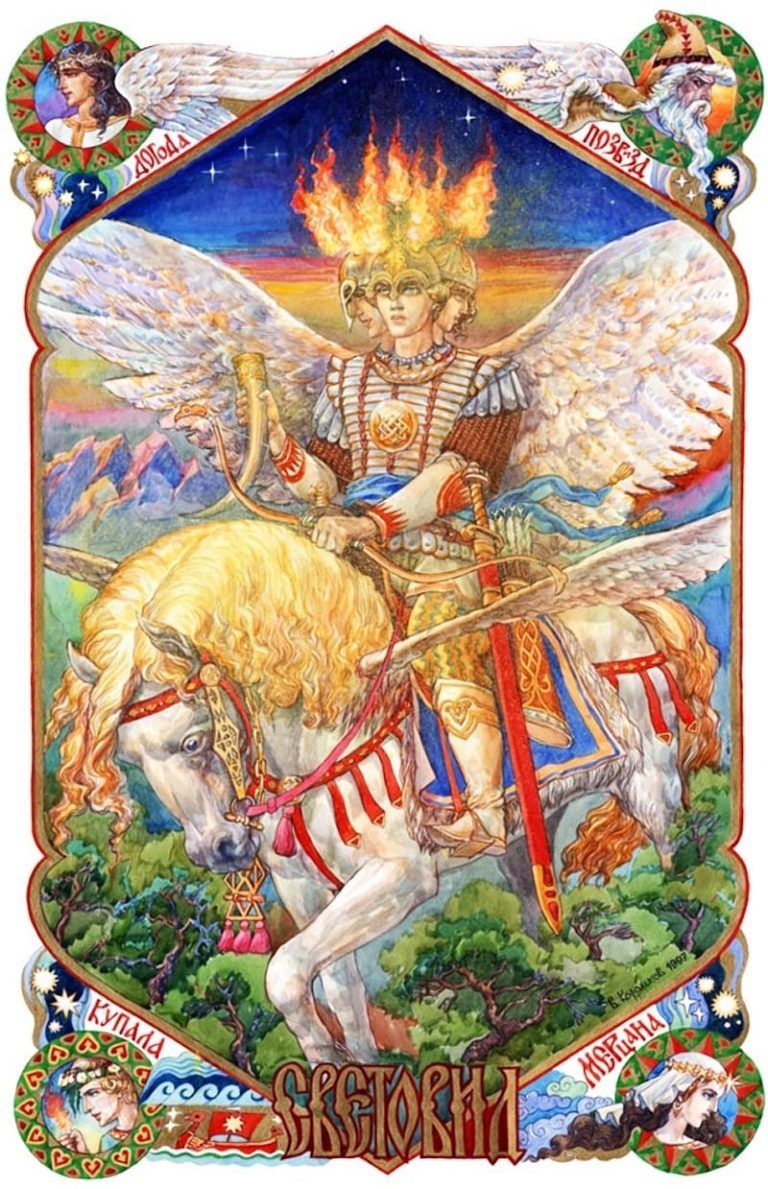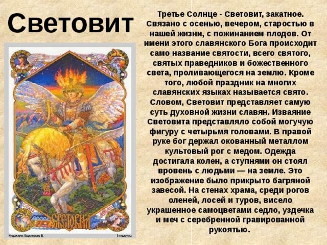 25 сентября 2024 Персонаж славянской мифологии этой недели - Световит! ------------------------------------------------------------ Световит (Святовит, Свентовид) Святовит — славянский бог, бог войны, победы и одновременно — бог земли и плодородия. Имя Святовит происходит от славянских слов. Первая часть имени указывает на принадлежность Святовита к светлой стороне. Вторая часть имени вызывает вопросы исследователей. Корень «вит» может указывать на родство со словами «витязь», «воин». Если такая трактовка верна, то Святовит — это «светлый воин». Святовит считался добрым богом, сильным, могущественным и справедливым. На острове Руяне в Балтийском море, в священном для всех балтийских славян городе Аркона Святовиту воздвигли храм — великолепную деревянную постройку. В храме стоял дубовый идол выше человеческого роста — великан с четырьмя головами. Каждая голова Святовита смотрела на одну из частей света, и ничто не могло скрыться от его взгляда. Бог сжимал в руке рог, который каждый год наполнялся вином, рядом лежал громадный меч, поднять который можно было лишь вдвоем. Кроме того, в храме хранились и военные атрибуты Святовита: меч, знамя и копье. При храме жил белый священный конь. Считалось, что по ночам бог выезжает на нём, чтобы принять участие в сражениях с врагами. День осеннего равноденствия - это Закрытие Сварги (мира богов) и День старого солнца, Световита. Считалось, что в эти дни начинается Новый Год, Новолетье. Четыре лика солнца В славянской культуре солнце за год проживает целую жизнь — оно рождается в Зимнее Солнцестояние маленьким Колядой, в весеннее равноденствие становится прекрасным парнем Ярилой, набирает силу и становится мужем Купайло в Летнее Солнцестояние и превращается в старика Световита к осеннему равноденствию. Вместе с солнцем меняемся и мы — каждый год проживая целую жизнь. В течение года мы проходим с природой все циклы — от рождения до умирания. Главным, ключевым точкам года древние дали имена богов, наделив их определенными качествами. С тех пор мы не просто проходим год — через богов и их трансформации мы познаем самих себя. Всему свое время и свой час. Гармонично двигаясь по коло-году, мы синхронизируемся с его потоками. Круг Солнца Купайло, летнее солнце, состарился и трансформировался в Световита. Лучи его более не греют, он много повидал на белом свете, поэтому глаза его сияют холодным, запредельным светом и в них отражается весь мир с радостями и печалями. Ещё немного, и он навсегда уйдёт за тридевять земель в Сваргу, чтобы возродиться вновь в декабре веселым ребенком Колядой. Многоликий Световит Световит — один из мощнейших богов славянского пантеона, сила его так велика, что он проявляет себя людям только в это осеннее время, в лике солнца. Русский исследователь фольклора Александр Афанасьев в книге «Древо жизни» писал: «...основа же имени (свят — свет) указывает в Световите божество, тождественное Сварогу: думаю, это прозвания одного и того же высочайшего существа». Световита изображали с четырьмя бородатыми головами, обращенными в четыре разные стороны; в правой руке он держал рог, наполненный медом, в левой меч или лук.Четыре головы символизировали власть бога над четырьмя сторонами света, четырьмя ветрами и четырьмя сезонами времени, можно сказать, что Световит — космический бог пространства и времени. Знаки вр