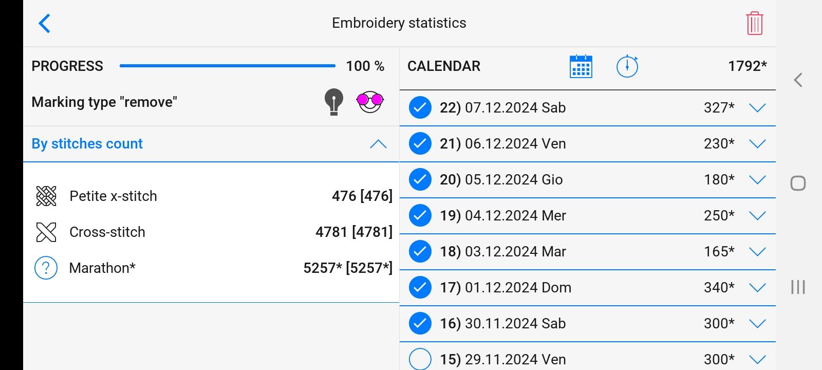 9 декабря 2024 Отчет 1. Вышить 250 крестиков цветами: Желтый/Оранжевый/Розовый/Красный. Можно взять один цвет или их сочетание. + Посвящение божеству (100+) - Дед Мороз Было: стало: 2. Вышить 100 крестиков на сюжете с пейзажем (пейзаж любой, в том числе с водоемом, строениями, людьми и животными). + 4. Вышить 100 крестиков на сложном процессе. - большой процесс, долгострой + Дар богам (1000+) Было: стало: 3. Вышить 100 крестиков на основе: Аида, страмин и другие ткани регулярного переплетения (видна квадратичная структура). + Эстафета (300+) Было: стало: И это ФИНИШ Ф9 (38968х) korund, tessykat, wednesday_next и 20 других сказали спасибо Поделиться сообщением Ссылка на сообщение