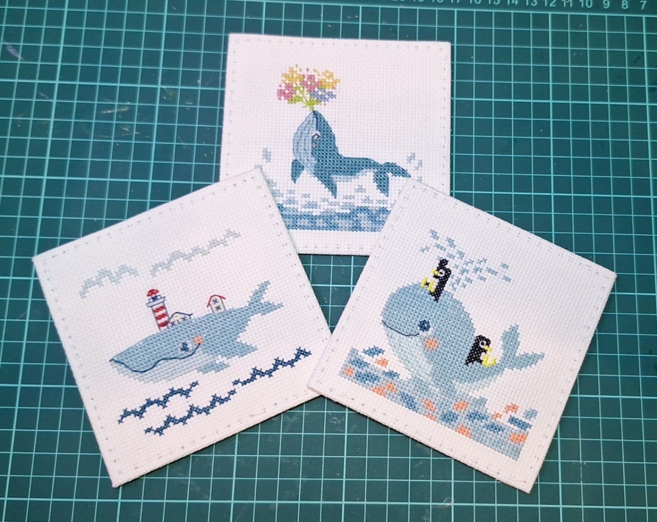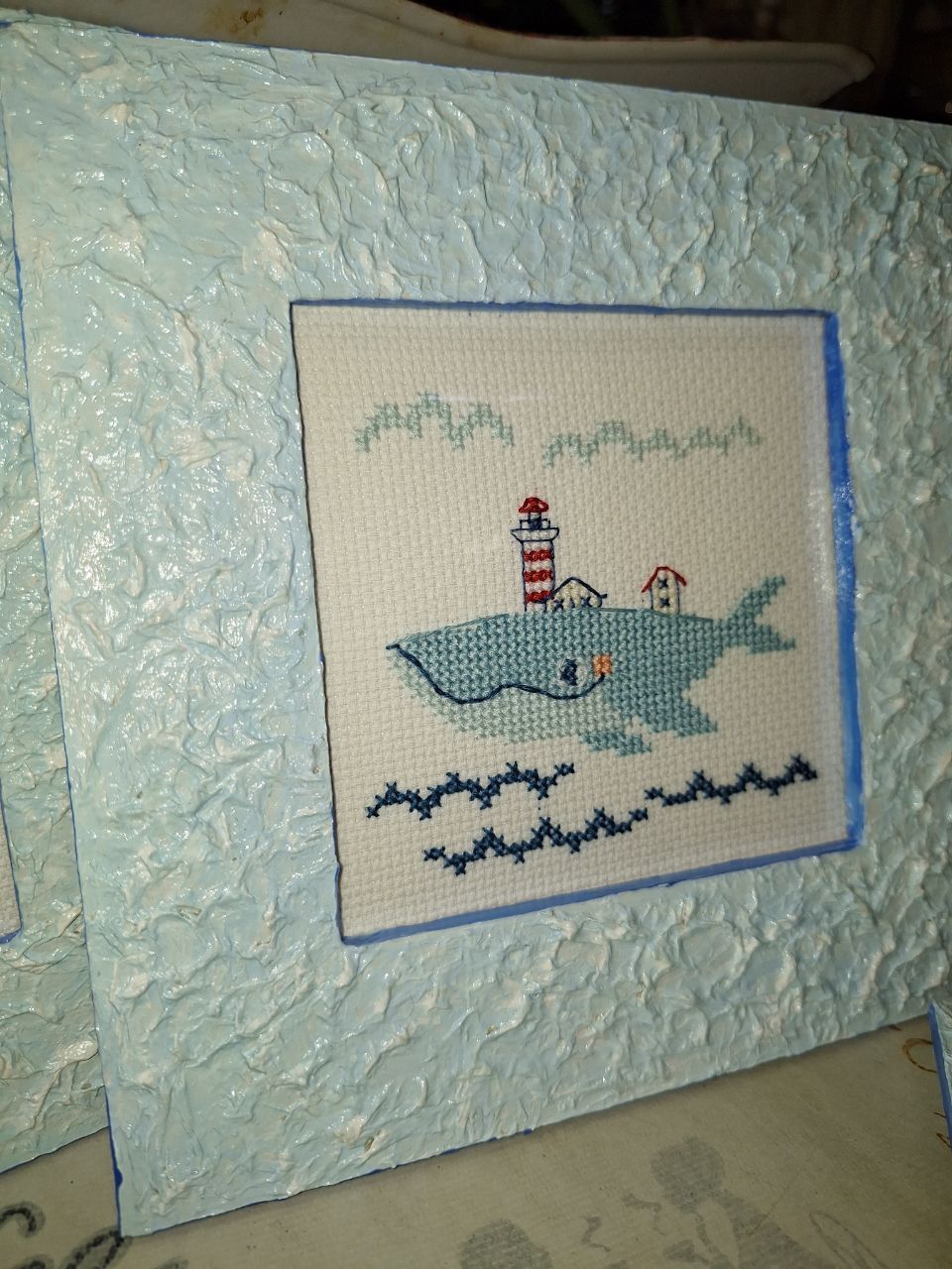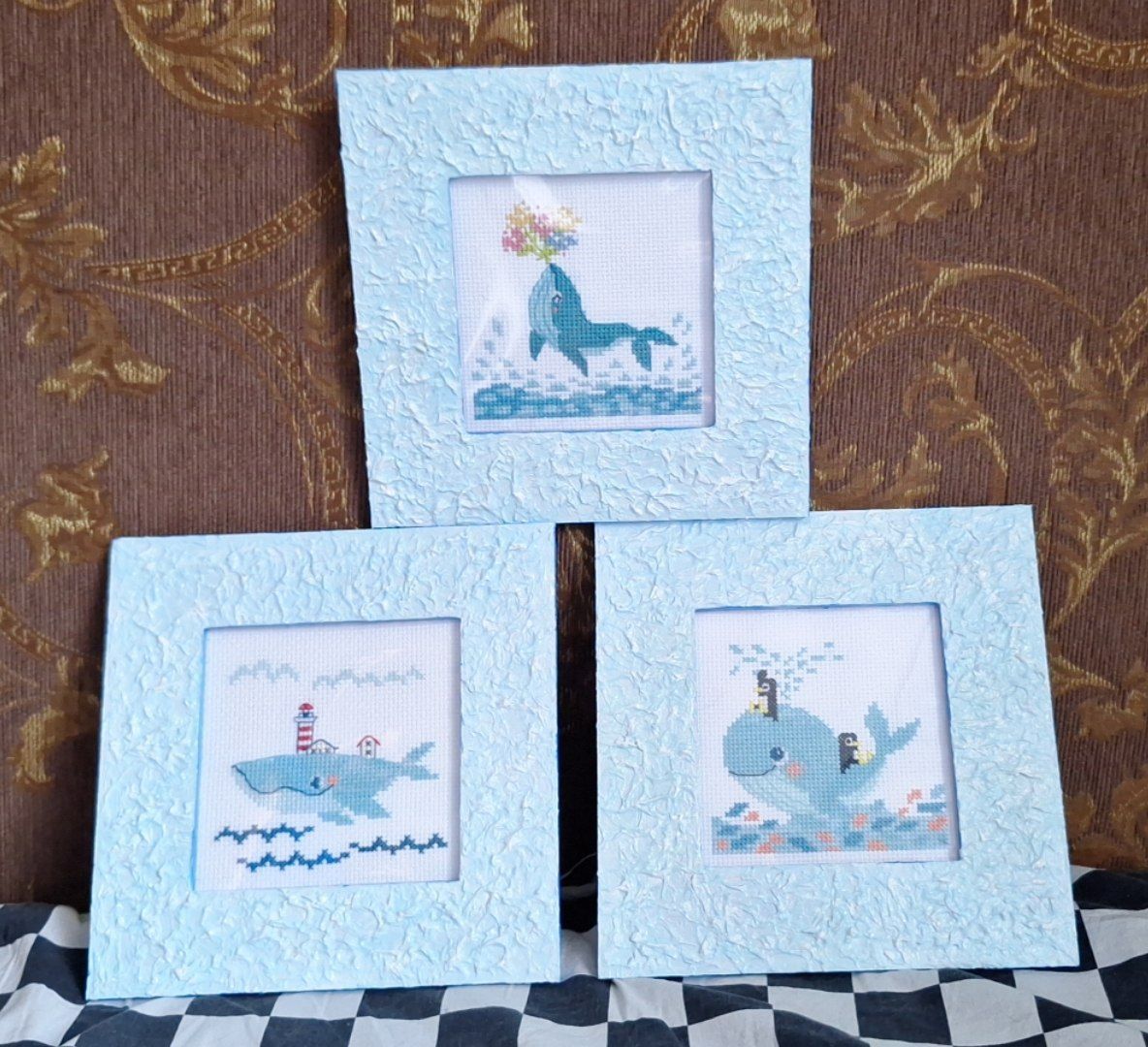 7 октября МОРСКИЕ РАМОЧКИ ДЛЯ ТРЁХ КИТОВ Киты - моя мечта! Когда-нибудь я обязательно их увижу! Ну а пока скопилась у меня весёлая китиная стая от RTO. Что ж, пора их определить в рамочки. Размер каждого 9х9 см. Буду делать рамки сама, широкие, чтобы декорировать под некоторое подобие волн. 1. Напиливаю под выбранный размер деревяшки. Стусло или торцовочная пила в помощь (себе я в итоге купила торцовку). Склеиваею столярным клеем и ждуууууу, когда высохнет. Можно воспользоваться феном, но я предпочитаю оставить на ночь 2. Декорирую под замысел ежЫный. В данном случае салфетки, ПВА, акриловые краски и лак 3. Из тонкого штапика напиливаю палочки и приклеиваю квадратом. Получилось окошко, куда потом размещу вышивку 4. Пока рамки сохнут, готовлю вышивки. Картон, дырокол, нитки-иголка - опаньки! - и киты преобразились! Для красоты с обратной стороны (очень люблю, когда и обратная сторона тоже аккуратная) приклеиваю фетр 5. Не очень люблю оформленные вышивки, не защищённые стеклом. Но оно сильно утяжеляет готовую работу, да и резать стекло пока не пробовала (хотя стеклорез уже прикупила... ну так, на всякий случай, .. ёж же он почти хомяк ). Свои небольшие работы я защищаю плёнкой для ламинирования. Итак, нарезаю плёнку по размеру окна, вставляю работу и прикручиваю лепестки для фиксации работы ГОТОВО! Вот такие вот китиные дела... lamina-65, Тай Тари, yustik и 16 других сказали спасибо Поделиться сообщением Ссылка на сообщение