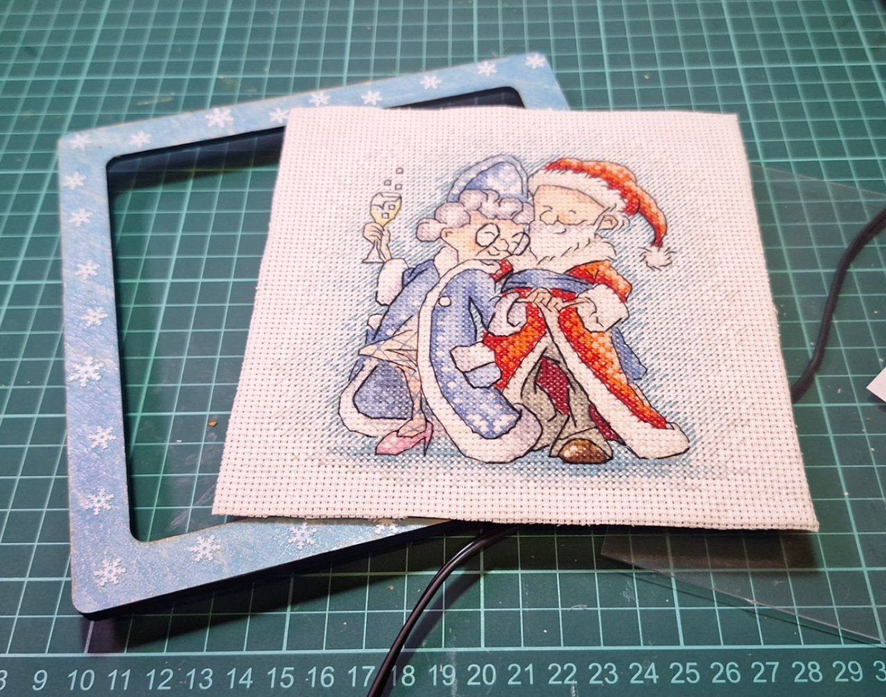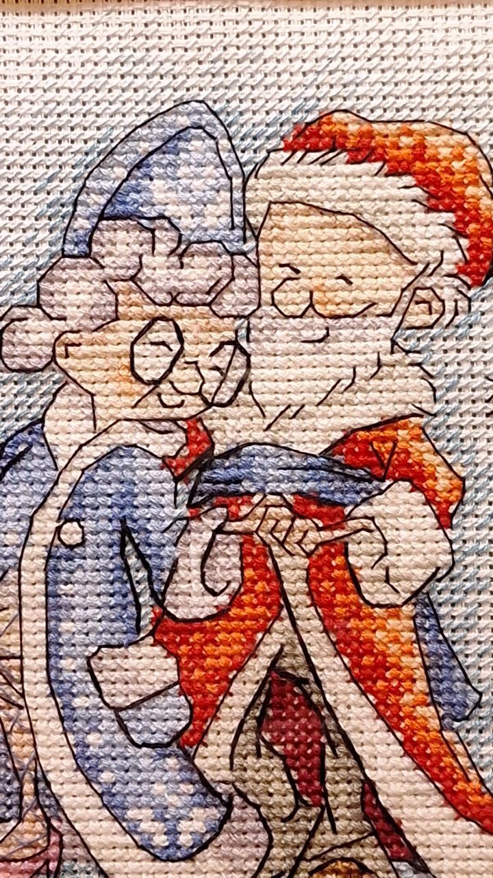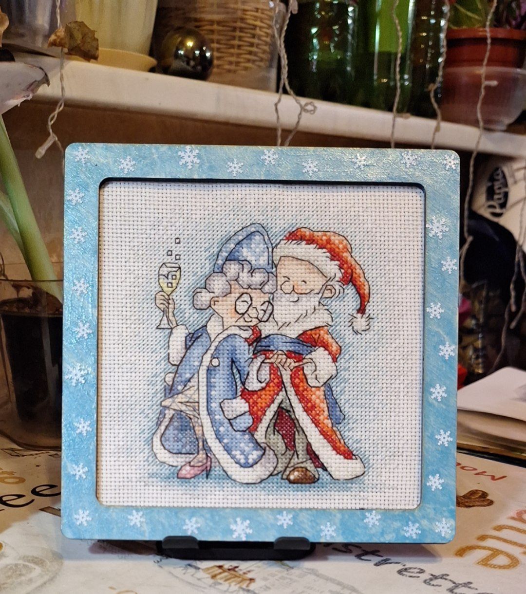14 октября ГОТОВИМСЯ К НОВОМУ ГОДУ! Andriana (Сделай своими руками) Б-26 Бабушка и Дед мороз Наконец-то нашла рамочку для первой вышитой задорной бабульки (серию купила всю, конечно же). Очень хотелось рамочку с закруглёнными внутренними углами. А эти рамочки из фанеры очень лёгкие, без покрытия, можно оформить на своё усмотрение. А уж мы-то, вышивальщицы, умеем усмотреть всякое! Итак... Погнали! 1. Вот такая вышивка и вот такая рамочка: 2. Для рамочки хочется голубой оттенок, но не плотный, а лёгкий, чтобы просвечивали элементы фанеры. Как морозная дымка. Для этого акрил вряд ли подойдёт, он очень плотный (хотя надо будет как-нибудь попробовать его разбавить до жидкого состояния, но это другая история). Попробую-ка я вспомнить школьные годы чудесные! С книжкою, с чем-то там, с песнею Как они быстро летят Их не воротишь назад НУ И НЕ НАДО! Отвлеклась что-то. В общем берем акварель. Что в ней хорошо - можно смешать краски и получить нужный оттенок простым добавлением воды. Получается что-то типа цветной морилки. Внутренние и внешние бортики и обратную сторону закрасила синим акрилом. Теперь надо дать хорошо просохнуть, так как акварель жидкая, а нам ещё лаком покрывать. Можно посушить феном, но я красила вечером и оставила на всю ночь. 3. Ну просто покраски нам, конечно же, недостаточно. Уж зима так зима! Достаём пайетки-снежинки (я покупала в Леонардо). Покрываем акриловым лаком рамку и сразу на неподсохший лак раскладываем снежинки. Как всё высохнет, нужно покрыть ещё слоем прям поверх снежинок, чтобы их лучше зафиксировать. Фото получилось не очень чёткое, сразу не разглядела с телефона. Ну ничего, на готовой работе будет видно лучше всю снежную красоту. 4. В данную рамку не получится вставить натянутую на картон вышивку, будет выпячиваться. Поэтому натягиваю бабульку на тот задник, что идёт с рамкой, и приклеиваю клеевым пистолетом. По краям всё лишнее срезаю. 5. Осталось собрать "творческий бутерброд". Главное - не забыть снять плёнку с оргстекла (или из чего тут сделан защитный прозрачный слой?) и прицепить крепление для подвешивания. Первая работа к Новому году готова! Путешественница, Проворные лапки, Тай Тари и 5 других сказали спасибо Поделиться сообщением Ссылка на сообщение