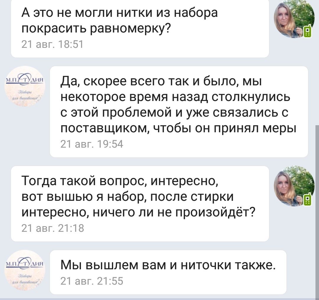 22 августа 2019 7 часов назад, МАУ сказал(а): Ай-яй-яй, накрывает паника... в пути мой набор из акварельной серии Я отшила Южную Голландию , яркую цветастую, вообще не было проблем, ничего нигде не полиняло. На очереди Осенние фонарики вот с ними возникла такая ситуация с равномеркой. Сегодня - завтра буду проверять нитки в воде, отпишусь по результату, хотя по ниткам производитель дал мне следующий комментарий (см.скриншот). Есть подозрение, что где-то косяк, раз они сами мне предложили нитки для нового набора.... А у вас случаем не Лисьи шалости набор в пути? Vika71, Хозяйка смешных зверей, WhiteMoth и 2 других сказали спасибо Поделиться сообщением Ссылка на сообщение