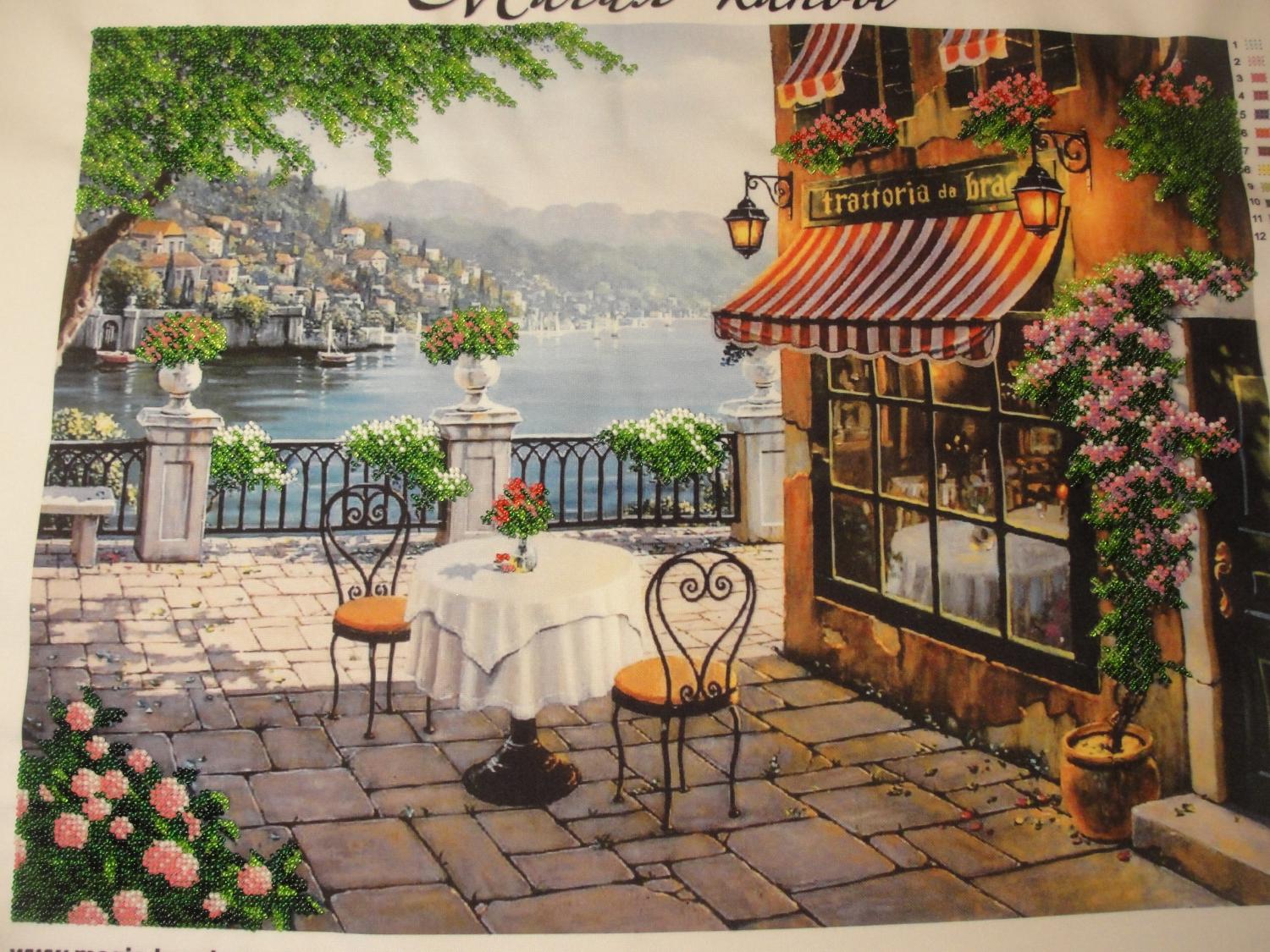 23 октября 2012 Закончила еще один процесс - "Итальянская сказка" от Магии канвы. Очень понравился сюжет на принте, вот и купила!) К тому же он прекрасно будет сочитаться с моими димами (которые с итальянскими пейзажами). Вышивать легко и не долго! Очень качественные материалы (за весь процес только две бракованные бисеринки!) Советую! Детали поближе оформлять буду значительно позже, работа большая, пока надо подумать как буду оформлять, может когда-то оформлю вместе с димами, еще не решила!) Танюша, какая красота! умница! хочу посидеть в этом кафе и выпить чашечку любимого кофе Татуся сказал(а) спасибо Поделиться сообщением Ссылка на сообщение