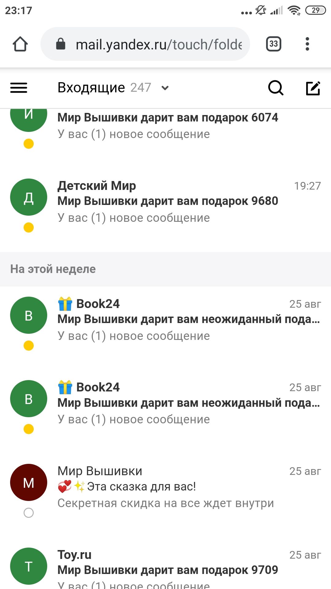 27 августа 2020 2 минуты назад, Novia сказал(а): Да уж.... Оставила в этом магазине свой мейл на случай появления нужного набора в продаже, даже ничего не покупала и не регистрировалась. И всё - теперь вся почта в этом спаме Доброй ночи напишите свою почту в ЛС, уберем его из рассылки. Она же просто автоматическая Поделиться сообщением Ссылка на сообщение