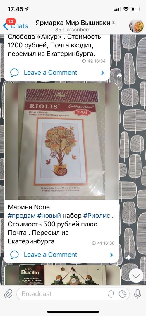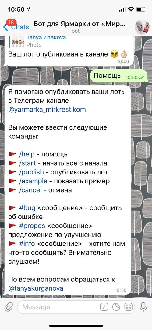 17 ноября 2020 Всем привет! Меня зовут Татьяна, и я занимаюсь усовершенствованием Ярмарки Мир Вышивки! Мне вы можете задать все вопросы по проекту и рассказать свои пожелания и предложения. И я с удовольствием отвечу) Расскажите, вы уже видели нашу новую версию в Телеграме?) https://t.me/yarmarka_mirkrestikom - канал, где список наборов на продаже и https://t.me/mirkrestikomyarmarka_bot - бот, который помогает в этот канал наборчик опубликовать Видели, пробовали? Расскажите, как вам? Удобно ли? Кажется ли более современным, чем чат в Вайбере? Какие увидели недочеты? Все учтем! Pirani@, Surik и Пумочка-13 сказали спасибо Поделиться сообщением Ссылка на сообщение