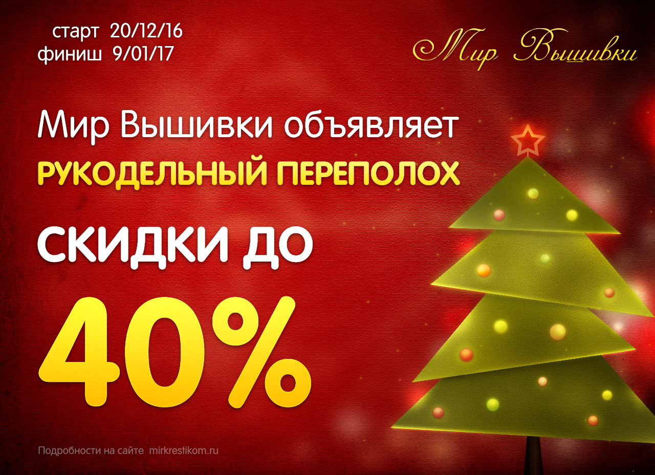20 декабря 2016 Дорогие друзья! Сегодня стартует самая грандиозная акция уходящего года "Новогодний переполох"! С 20 декабря по 9 января (включительно) Вас ждут скидки до 40% на популярные рукодельные товары от самых хитовых производителей! Уже сейчас первая порция наборов и схем для вышивания, мозаичных картин, наборов для создания игрушек и раскрасок по номерам доступны для покупки! Еженедельное добавление акционных товаров! Успейте первыми приобрести хиты по "вкуснейшим" ценам! Количество товаров ограничено! Все акционные товары Вы найдёте здесь: http://www.mirkrestikom.ru/offers/?utm_source=stichsu&utm_medium=stichsu&utm_campaign=stichsu Nata_Struchkowa, Galagenka, N.Natali и 1 другой сказали спасибо Поделиться сообщением Ссылка на сообщение