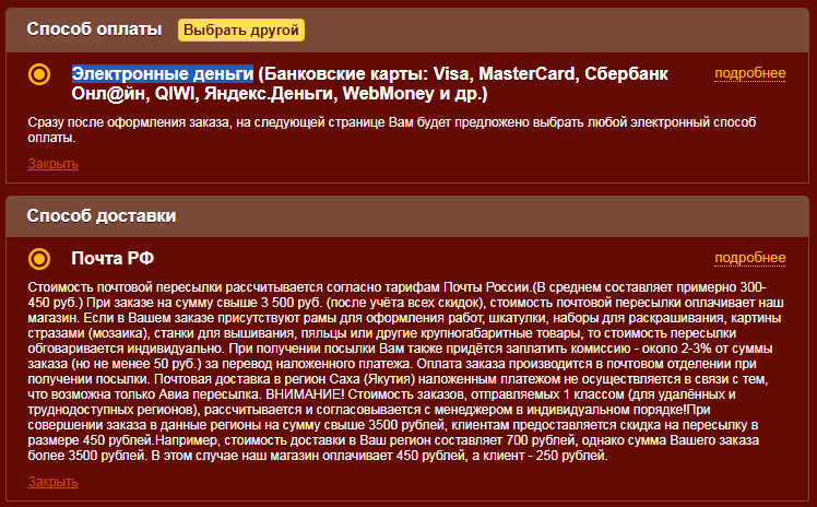 30 августа 2017 Добрый день! Оформляю заказ на Вашем сайте. При выборе варианта оплаты "Электронные деньги" способ доставки автоматически устанавливается как "Почта России". А чтобы я смогла выбрать доставку в пункт выдачи, приходится выбирать вариант оплаты "Наличными в пункте выдачи заказов": а для меня идеальный вариант - это оплатить картой сейчас и забрать уже без оплаты из пункта выдачи. возможно ли как-то помочь?.. или это я что-то делаю не так Mirkrestikom сказал(а) спасибо Поделиться сообщением Ссылка на сообщение