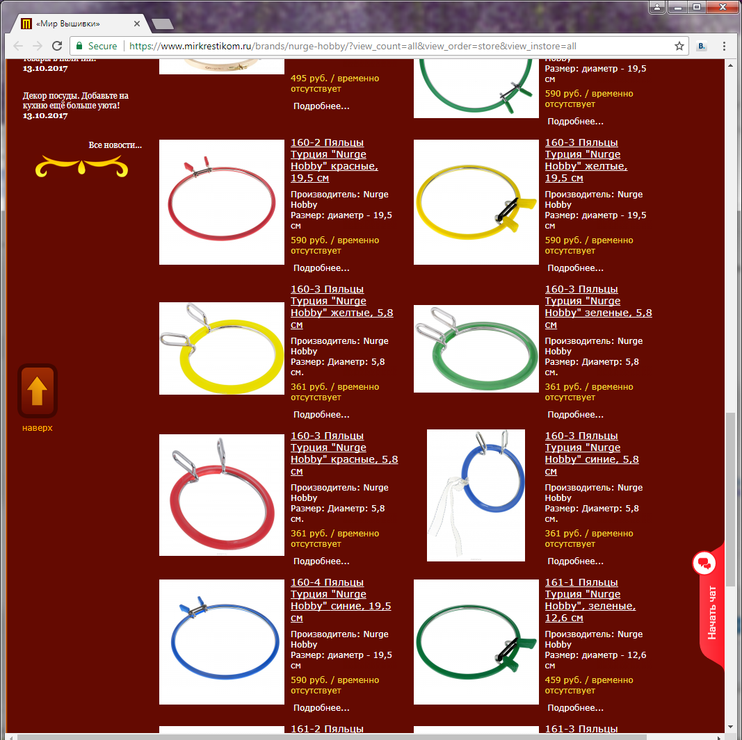 16 октября 2017 25 минут назад, Mirkrestikom сказал: Светлана, здравствуйте! Пяльцы "Nurge Hobby" появились в продаже! Размер 5,8 см тоже представлен на нашем сайте! https://www.mirkrestikom.ru/brands/nurge-hobby/?view_count=all&view_order=store&view_instore=all по ссылке - желанные пяльца всех размеров - временно отсутствуют. Или за 20 мин их все уже раскупили? Mirkrestikom сказал(а) спасибо Поделиться сообщением Ссылка на сообщение