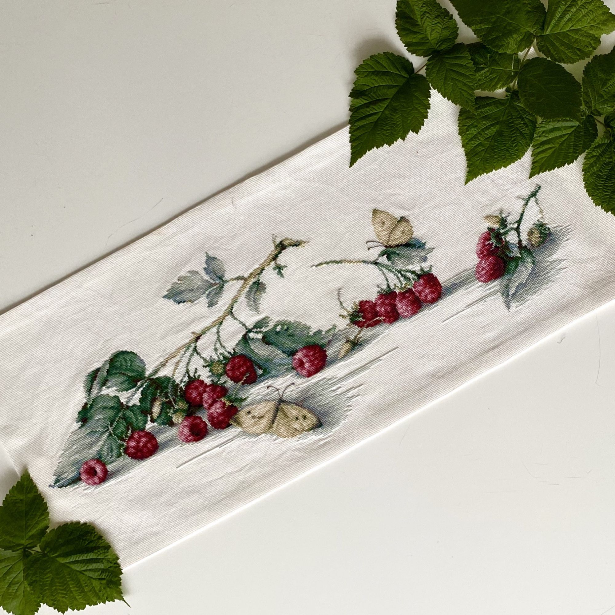 13 октября 2020 Хочу поделиться впечатлениями от набора «Малина и бабочка». Сначала долго привыкала к схеме, потом приноровилась складывать листы в несколько раз, чтобы перед глазами держать только отшиваемый фрагмент. Очень меня забавлял тот факт, что на схеме элемент дизайна оказывается по размеру больше, чем на самой вышивке. Вообще именно с этим набором я поняла, что такое правильная организация рабочего места, до этого спокойно шила на диване на коленях, схема слева, нитки справа, грубо говоря, и горя не знала. А тут при таком подходе не получалось ни-че-го ))) Зато теперь у меня все эргономично, удобно и есть куча иголок, потому что вышивать одной иглой по 2-3 крестика - мазохизм чистой воды. Ниток хватило, предсказуемо почти закончились те, которых изначально было мало и с большим запасом остались серые и зелёные оттенки, которых было много. Но шила я очень-очень экономно. Сюрпризы меня поджидали на этапе окончания работы, сначала оказалось, что я неверно определила центр работы и правый край дизайна практически упёрся в край ткани, пришлось на ходу отбрасывать последний листик малины и последний лист схемы, незапланированно завершив работу. А при стирке потекли темно вишнёвые нитки прямо на белый фон под малинами, прокипятила работу с нашатырем - канву спасла. Но дальше она ни в какую не хотела разглаживаться даже в мокром виде, вся незашитая часть покрылась мелкими заломами. И это точно не от пялец. Натянула влажную ткань на раму, оставила до полного высыхания, потом ещё отпарила, стало лучше, но не идеально. Очень надеюсь на натяжку в багетке, но вообще мне это все, конечно, не сильно нравится. Но при всем при этом мне очень понравился и сам процесс, и безумно радует результат, скорее всего буду шить этого производителя ещё. wita1077, Pirani@, Чивава и 24 других сказали спасибо Поделиться сообщением Ссылка на сообщение