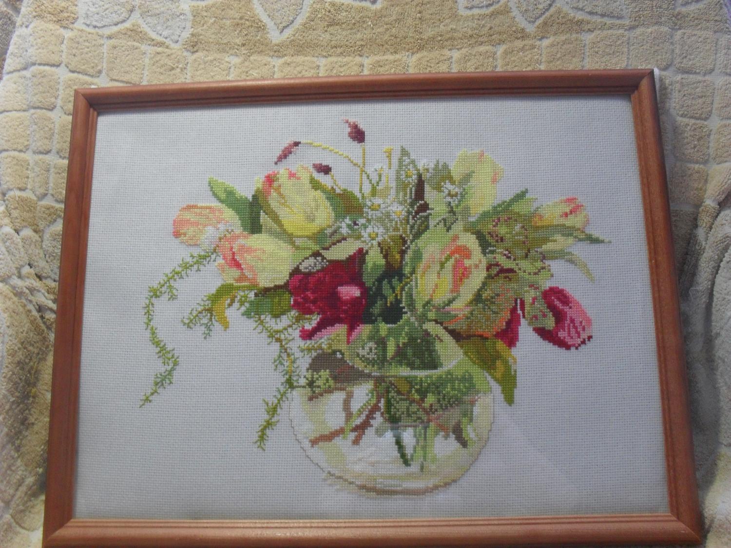 21 апреля 2015 вышивала по набору от "Белоснежки" ровно месяц" 30х40 см., 62 цвета, канва Аида 14,кое-какие цвета подбирала сама, поскольку в наборе некоторые нитки показались мне слишком яркими-ядовитыми.Немножко на свой вкус изменила рисунок- убрала совсем синий цветок. В целом картинка получилась в сочетании нежно-зеленого и желтого цветов. В рамку еще не оформила, просто подставила для фотографии. У нас тут багетных мастерских приличных нету, поэтому оформлю сама в простенькую рамку. Красивые цветы. Никогда не видела наборов этой фирмы. сурепка сказал(а) спасибо Поделиться сообщением Ссылка на сообщение
