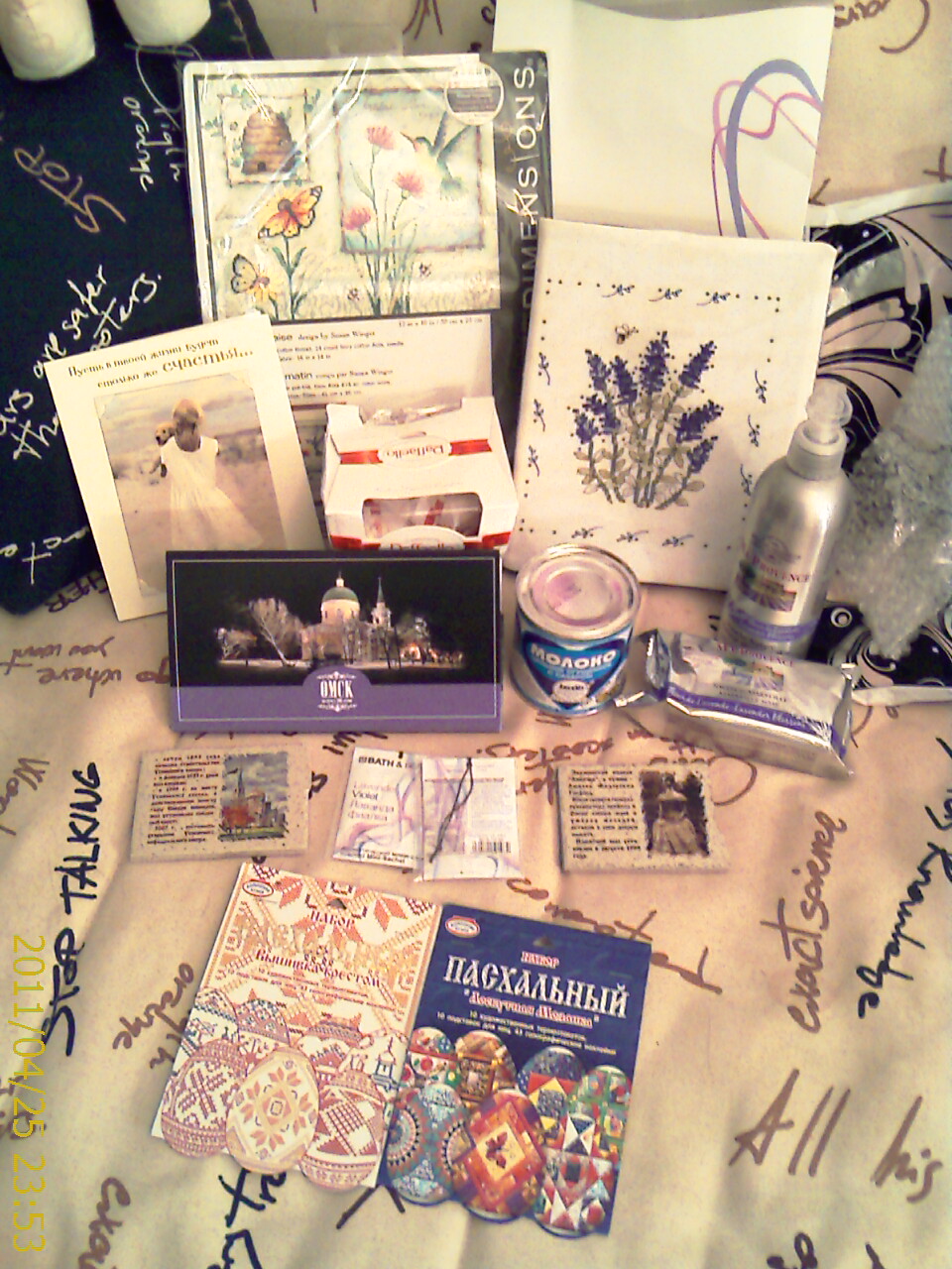 25 апреля 2011 Итак, мой отчет о получении посылки. А мне посылочка пришла из Омска, от Wian - Валентины. Сразу прошу прощения за качество фото, тк съемка была вечером на телефон. Вот такое богатство я получила в посылочке: . Валечка, ты волшебница, это точно! Так угадать со всеми подарками! - Я очень люблю сгущенку, могу есть ее банками, а ребенок ждет-не дождется возвращения из школы, дабы протянуть лапки к Рафаэлькам, которые весьма уважает. - я обожаю запах лаванды! Теперь я буду очень вкусно пахнуть. - Мы с матушкой (да и Танюшка присоединилась к этому увлечению) собираем магнитики. А мое имя - Любовь. Омский памятник моей тезке приятно удивил, а магниты получили большУю порцию восхищения от матушки и меня и были отправлены на пмж на холодильник. - Пришел Сюрприз аккурат на кануне Светлой Пасхи, так что этот подарок, да еще и такой красивый, да еще и вышивать нельзя, пришелся как нельзя кстати! - Открыточки! Омск очень красивый город, и, если будет возможность, я с радостью съезжу этим летом на экскурсию, чтобы самой прогуляться на этому прекрасному городу. - Весна! Очаровательный набор! Я с большим удовольствием вышью его и буду хвастаться всем, кто придет в гости, откуда приехала эта чудесная вышивка. - Большое спасибо за теплые слова, за рассказ о твоем любимом городе. Я обязательно сохраню его так, как оно приехало - в открытке! А матушка заметила, что изображенная девочка чем-то похожа на меня. И самое главное - сам сюрприз! Тетрадочка, на обложке которой лаванда и пчелки! Всё так красиво, аккуратно сделано, я в восхищении! Очень весенне получилось, нежно и просто прекрасно! Валечка, большое-большое спасибо тебе за такой прекрасный сюрприз, за великолепные подарки, за замечательное письмо! За ту радость и счастье, что принесла в мой дом твоя посылочка! Спасибо не только от меня, но и от моей матушки, от маленькой девочки Танюшки, от ее няни. Спасибо! Wian сказал(а) спасибо Поделиться сообщением Ссылка на сообщение