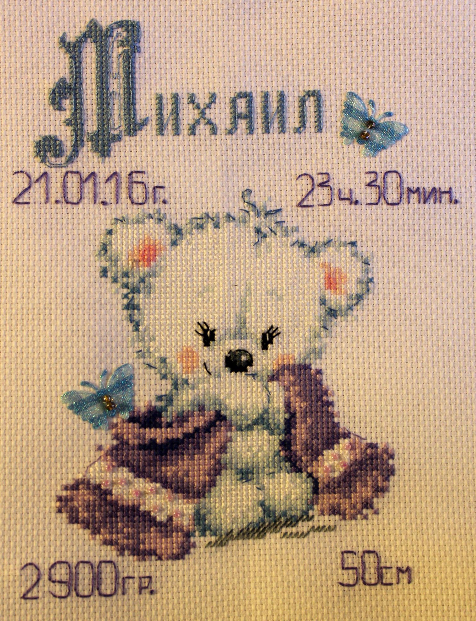 27 декабря 2016 А я с фото) За пару дней вышила метрику для Мишки. А то скоро ему годик уже, а метрики всё нет. Дизайн фирмы Чудесная игла "Мой малыш". С лентами не дружу, заменила на текстильных бабочек. Цветочки на полотенце тоже выкладывать не стала, а просто украсила бисером. Ну и имя металликом вышивать-это издевательство. Поэтому шила обычным мулине. В общем впечатления от работы приятные. Легко и быстро. Один огромный минус-нитки в наборе пушились, вечно вязались в узлы и рвались. Фото для гаечки. И сегодня же я начала Рыжую русалку от РТО ОльгаВл, ЛАДОМИРА, татьяна0674 и 5 других сказали спасибо Поделиться сообщением Ссылка на сообщение