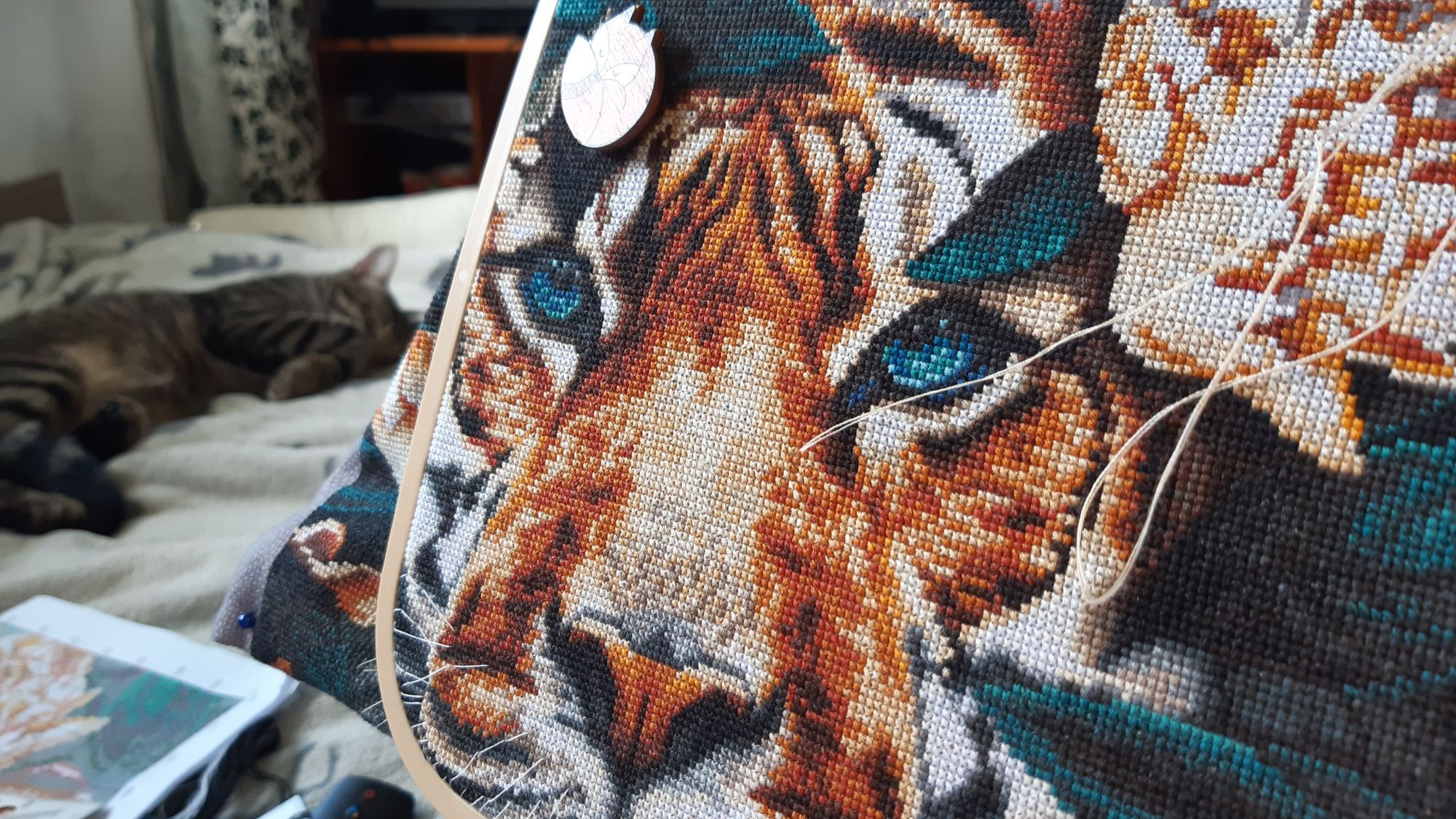 17 июня 2022 Закончила Тигра! Фото - прямо с с пялец) По итогу-фирма очень понравилась, но походу в России их наборы теперь днём с огнём не найдешь (хотела еще льва себя, но не нашла). В закромах есть пантера из этой серии, но её значительно позже буду вышивать. Когда вышила половину работы-случайно нашла сагу, это ускорило и облегчило процесс. Хотя я бы не сказала, что вышивать было трудно-очень хорошо проработана схема. Хозяйка смешных зверей, Гало4ка, kreolka и 9 других сказали спасибо Поделиться сообщением Ссылка на сообщение