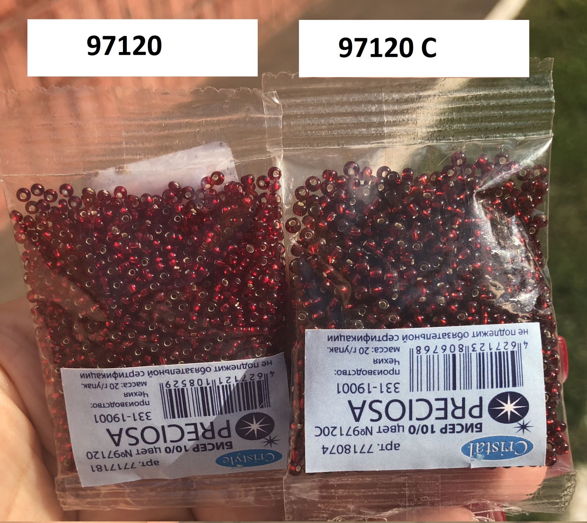 4 августа 2018 В 02.08.2018 в 12:44, Northern lights сказал: Спасибо за предположение, я думаю что это так и есть Моё любопытство меня победило и я купила бисер 97120 и 97120С. По факту и оттенок, и размер, и диаметр внутреннего отверстия разный. К стати, внутреннее отверстие в обоих случаях круглое. В магазине цвет 97120 бел указан, как темно-красный, а 97120С - бордовый. 97120С - более темный, оттенок более теплый, размер самой бисиринки и внутреннего отверстия больше, чем у 97120. Оттенок 97120 более светлый и немного уходит в малиновый. Сравним бисиринки: На всякий случай вот таблички с полными номерами сравниваемого бисера: Умничка, niksi, Vag222 и 13 других сказали спасибо Поделиться сообщением Ссылка на сообщение
