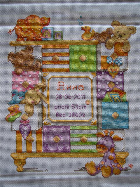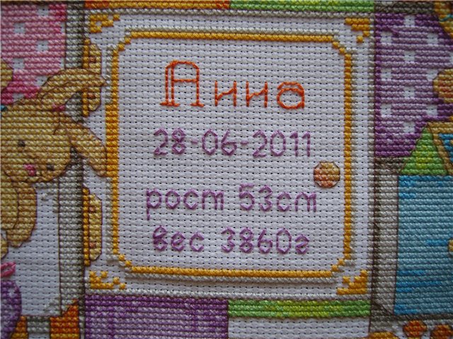 3 августа 2011 Натусь, метрика просто супер получилась! Если б мне нужно было метрику вышивать, я бы такую же выбрала. Она такая детская, яркая, позитивная Надпись очень хорошо смотрится ! Поделиться сообщением Ссылка на сообщение