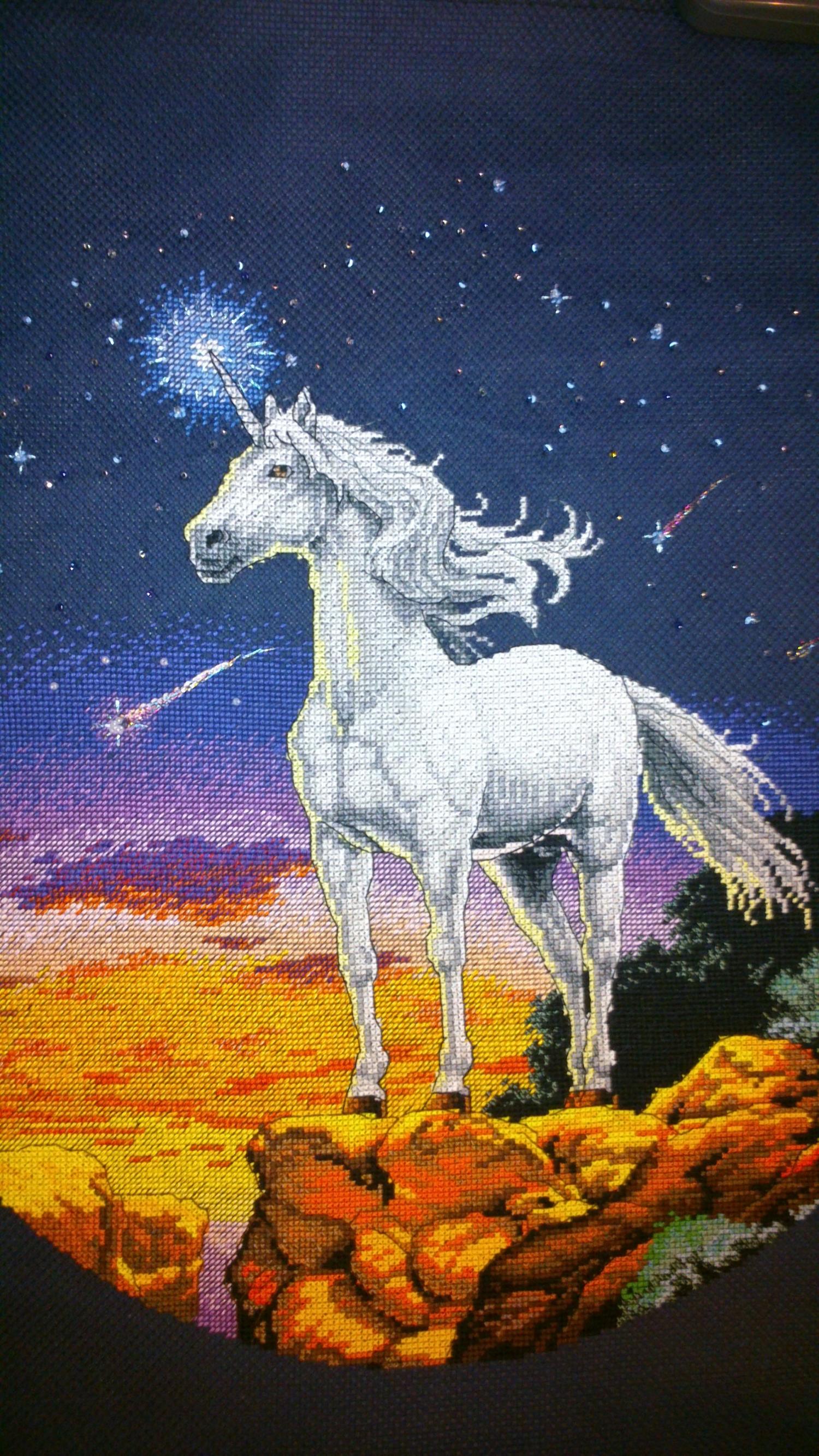 30 января 2013 Как же давно я здесь не была!!! Здрассте всем. Дошила я своего единорога и еще парочку подарков. Короче вот оно моё трудное щасте "На краю мира" (это у китайцев так называется) аналог ДИМовсого "Мистического единорога": Ну кто помнит моё начало этого китайского чуда скажу что далося мне это очень трудно. Думала уже если лошадь по цветам ниткам не соответсвует, брошу нафиг. Лошадь получилась на ура, фон тоже ничего, а вот со скалами намучилась!!! Короче всё что камни- шила подбором на глазок, потому как приложенные нитки не годились все по цветам. Звездочки шила бисером, кометные хвосты металликом на своё усмотрение. Что касается примет, даж не знаю что сказать.... Принц и впрямь нарисовался, но не без причуд, прям как эта эпопея с нитками: вроде лошадь и хорошая, но уж не знаю нужна ли она ваще с такой-то кучей чудес впридачу??? Веселюсьнемогу. Помнится девочки обсуждали, что если такие проблемы с нитками в наборе , то что-ж за кавалер-то привалит?)))Ну что теперь нового единорога шить? Или уж с этим поколупаться пока? ЛАДОМИРА, Лена1973, Графиня и 1 другой сказали спасибо Поделиться сообщением Ссылка на сообщение