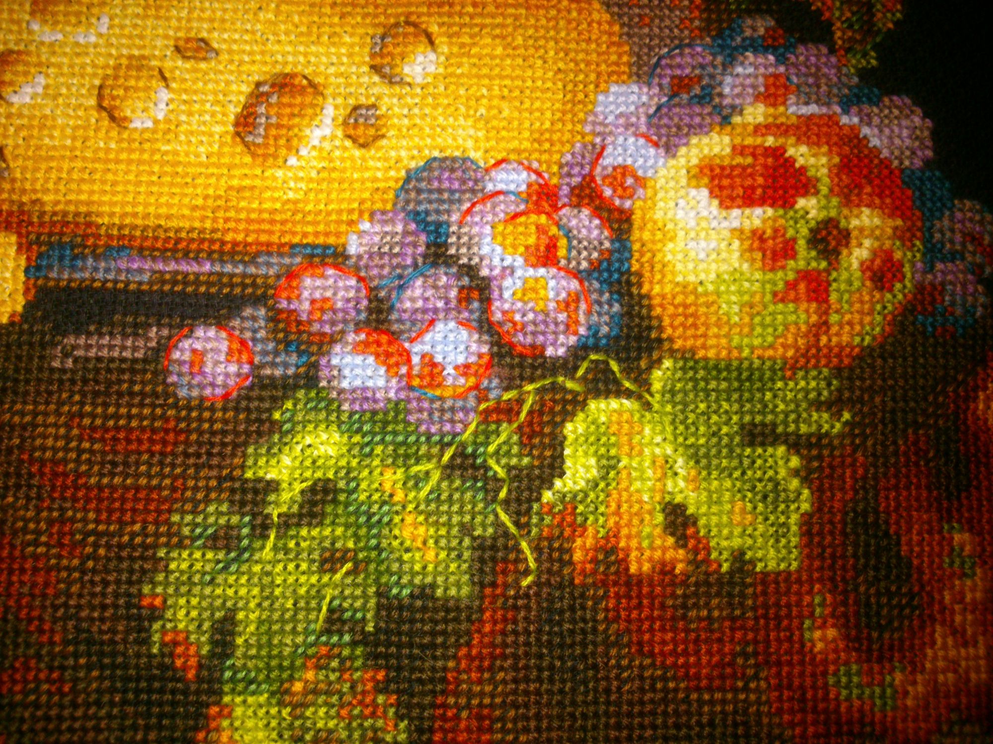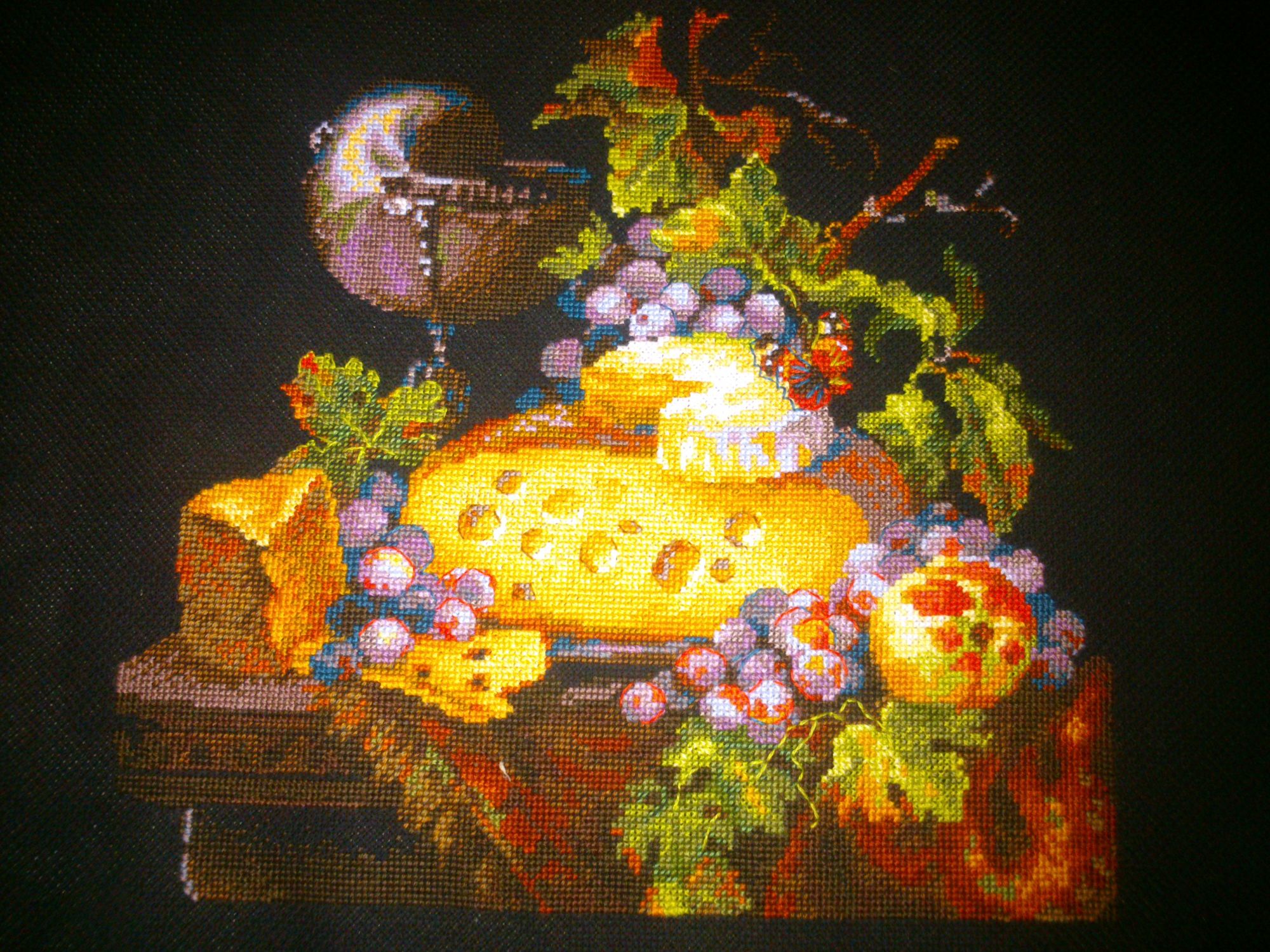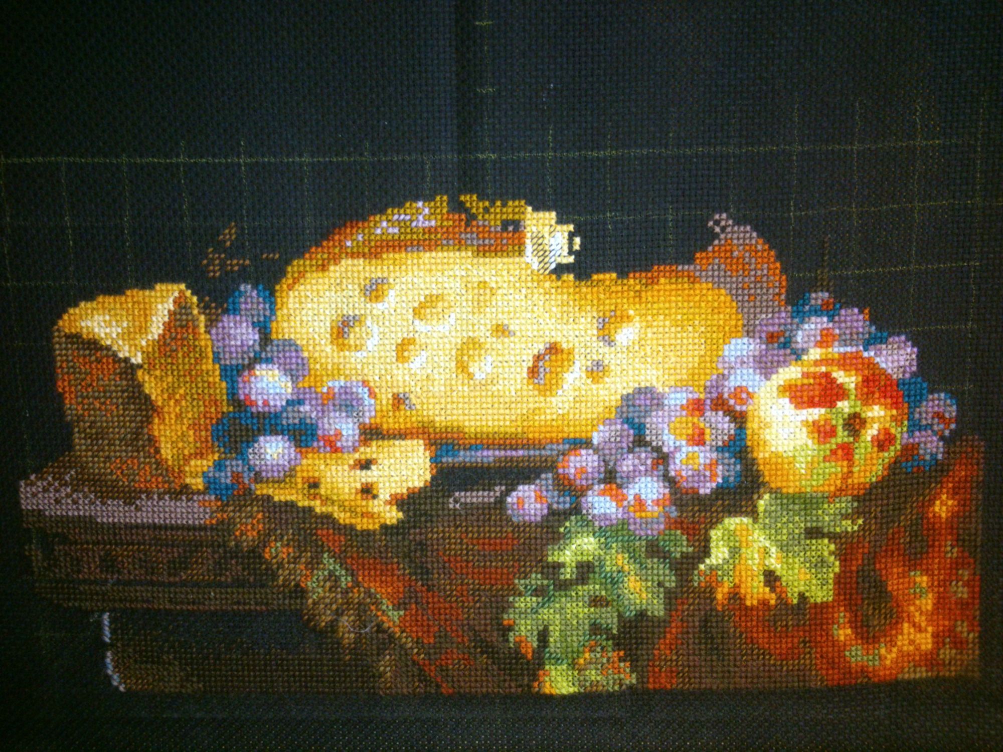 17 июля 2017 В 04.07.2017 at 19:09, Сердечко сказал: Инна, спасибо за процесс. Понаблюдаю с удовольствием. Люблю Риолис, черную канву , шерсть, натюрморты и сыр)) Аня, спасибо! Вот нашила немножко стол со скатёркой немножко фруктов фрукты со вспышкой ну и сыыыыр пара кусочков уж и не знаю что за сыр слева... гниловатый такой что ли ? В 04.07.2017 at 19:09, Сердечко сказал: И если можно, жду фото с комментариями о процессе. Комментирую. Шерсть шью второй раз в жизни, а уж такую вырвиглазную уж точно первый! Наверное уже доконало это зимнее лето и захотелось чего-то яркого, вот и шью. Шью неправильно. Полукрестики надо \\\, а я-///, но у меня географический кретинизм от таких \\\ . вот. но воде ничаво так выходит. Кресты в 2 нитки не хотят лезть в дырки и укладываться ровно, но если честно-мне пофиг. нравится и всё. Повторюсь- тема, сюжет и вообще всё не про меня, но видать на этом этапе мне это надо. Полукрест, крест в 1-2 нитки, блэнды, схема неправдоподобно лёгкая. вот в общем и всё. Девушка моя с укоризной машет мне шляпой, но пока не домахивается до моей совести. Начала большую сырную шайбу. дырки. Никто не знает, для похудения надо девушку в шляпе шить? или в руках тоже сойдёт? Безобразная погода успокаивает, что вообще раздеваться не придётся, вот я и расслабилась, дожралась до безобразного состояния + 5 кило и ничего летнее не налезает кроме трикотажа на резинках, а блин покупать что-то новое жаба душит.... А печеньки такииие вкусные Veta, ЛАДОМИРА, Yulik и 2 других сказали спасибо Поделиться сообщением Ссылка на сообщение