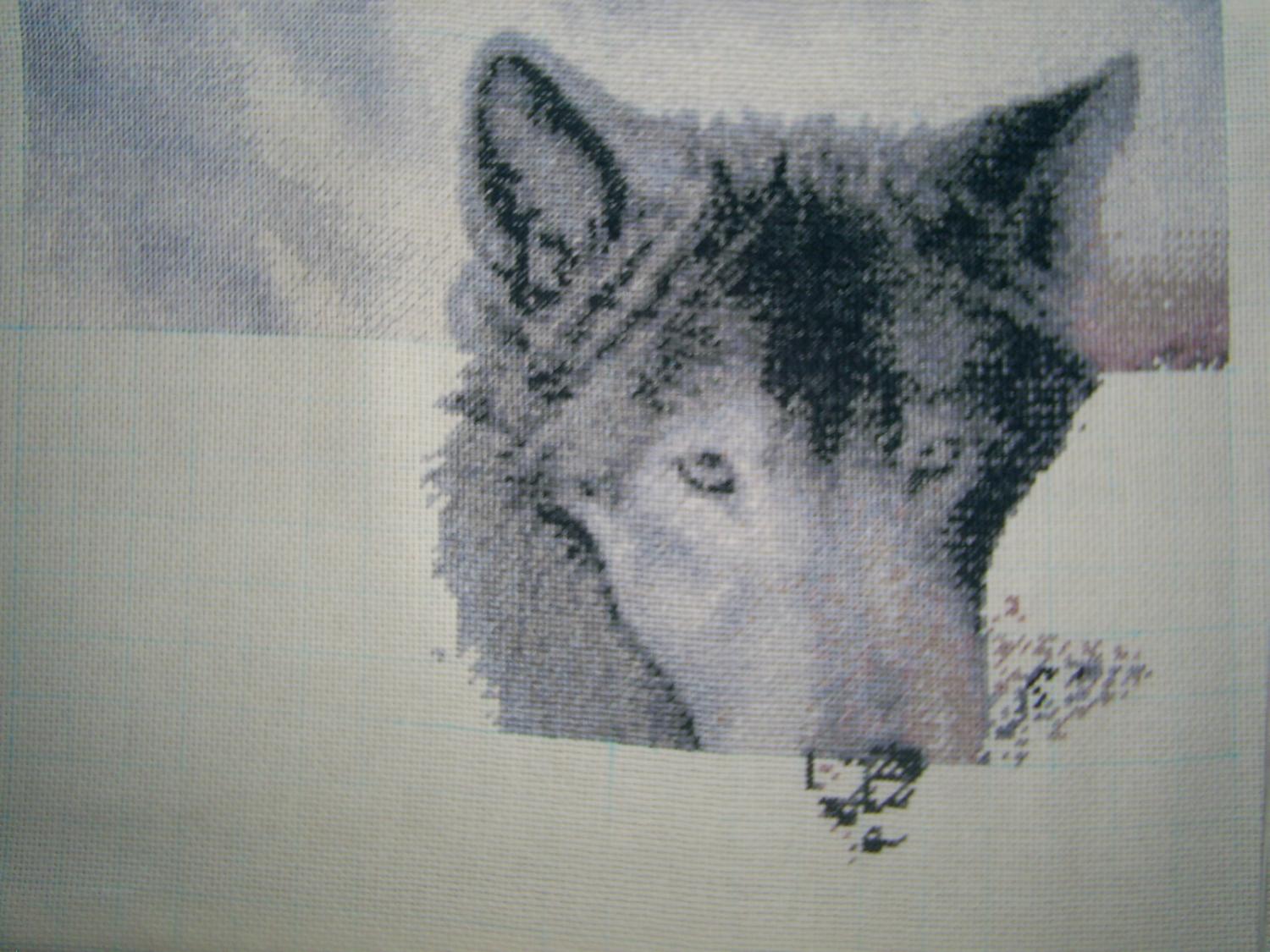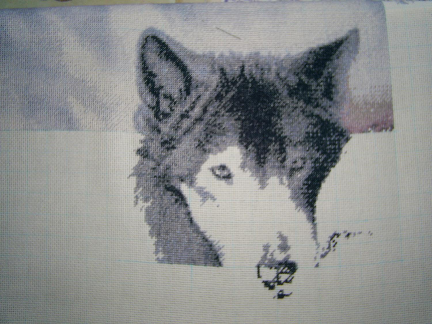 Фон шью в 2 нитки, нормально смотрится, как-то акварельнее что-ли. Может потому что канва кремовая каких-либо пробелов и просветов не вижу. Волчье лицо получается за этот счет более выпукло. Короче у кого такая схемка заныкана-могу рекомендовать такой способ. Леса и горы тоже буду в 4 шить. :rolleyes: