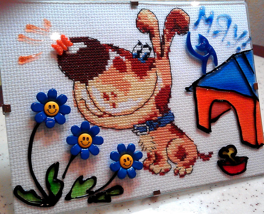 15 сентября 2011 Девочки, вот оформила красную машинку. Вот немного смущает лишняя канва по бокам - все же она квадратная. Но если сделать бархатное паспарту, которое я хотела сначала будет примерно это Вообще вот смотрю на нее - в жизни она намного симпотнее и канва как-то в глаза не бросается.. она как будто тут и жила, без паспарту шикарно Девочки, я оформила собачку.. Строго не судите - все же оформляла для ребятенка. Бабочка на носу, киска на крыше будки и цветочки - это наклееные штучки, а все остальное нарисовано витражными красками. А это была Сейчас бы сделала цветочки подальше от собачки.. Ну если отклеются так и сделаю нет, ну это надо же иметь такую бурную фантацию, сабакевич милый, а оформление выше всяких похвал Львица сказал(а) спасибо Поделиться сообщением Ссылка на сообщение