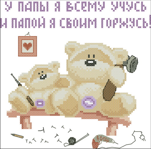 17 сентября 2011 Девочки, сегодня суббота, а значит очередная маленькая работа. Сначала немного предистории. Мне очень нравятся мишки Фуззи Муун, в поисках очередного на сайте КотенокГав (спасибо за наводку Оксане ЛендГрейп), увидела вот таких милашек Загорелась вышить своему мужу и сыну. Купила нитки. Задумалась.. что для нашей семьи рыбалка совершенно не актуальна, а больше как папа с сыном чего-нибудь крутят отвертками и стучат молотками.. Поэтому перенабрала эту схему в ПМ и внесла свои изменения. Затем я написала Надежде (автору схемы) письмо, в котором просила разрешение на выкладывание этот измененной схемы. На этой неделе ее разрешение я получила, поэтому приступаю. Вариант, который я вам сейчас покажу - это набросок Бэк будет взят с первоначальной схемы, а рулетка и дрель будут получше сделаны уже во время вышивки. В планах вышить еще 3-4 дизайна на эту тему и сделать либо коллаж, либо фотоальбом, либо и то и другое под общим названием "папа с сыном"-как они вместе что-то чинят, как вместе гуляют, читают и играют Поделиться сообщением Ссылка на сообщение