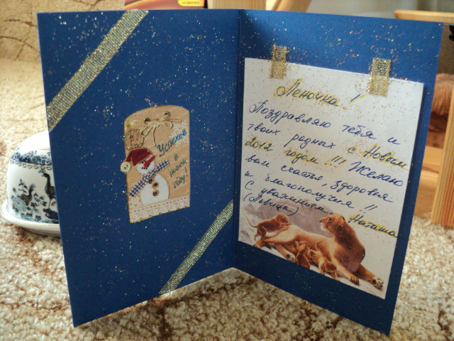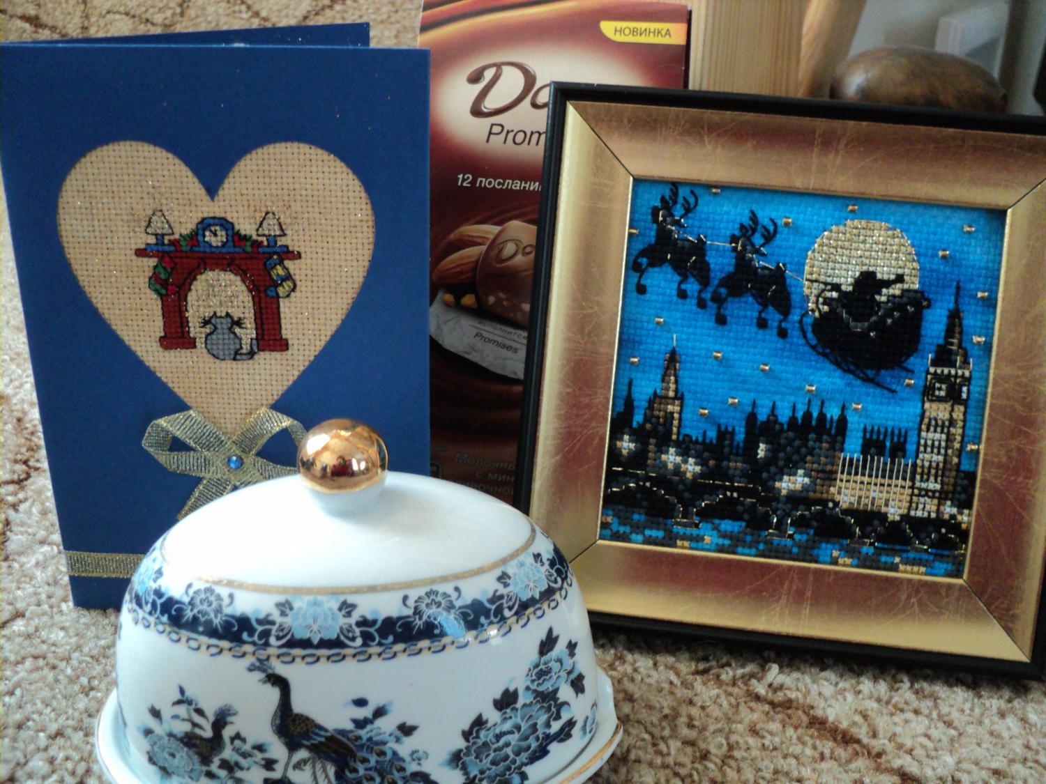 16 декабря 2011 Я опять пришла! Теперь с фоточками! Итак, вот как (или примерно так) выглядело содержимое посылочки Сладенькое я пока даже не открывала, оставила до ГН, там мне ещё 12 пожеланий достанется ! Чудесная открытка, вся посыпанная блёстками, украшенная ленточками и бантиком. И как всё аккуратно сделано! И как точно, и с каким вкусом! Не открытка - мечта!Наташа, у тебя красивый почерк! А твои пожелания тронули моё сердце! И ещё вот такая чудесная работа! Красота, всё очень тонко! А канву Наташа красила сама, и такие интересные переходы цветов получились! Я подозреваю, что и раму сама старила. Даю два фото, не знаю, какое лучше. А вот это не ещё одна картина. Это оборотная сторона!!! Наташа, какая великолепная идея отдекупажить (не знаю, как правильно выразиться) её. И даже рама вся в блёсточках! В общем, можно вешать, как самостоятельную работу! И ещё вот такой милый магнитик, и он мягкий! Чесно сказать, здесь подарков на троих! И я стала счастливой обладательницей чудо-посылки! Праздник поселился в моём доме! Чуствую, что ещё не все слова сказала. Я вчера, когда её получила, а инет не работал, не знала куда дать эмоции. Я есть не могла. Я перебирала, перекладывала, складывала, опять доставала. Потом поняла, что мне срочно нужно поделиться этим, и послать весточку на форум! Позвонила Ольге (Лисе), она разделила со мной радость, и отправила тебе, Наташа, весточку! Оля, отдельное тебе спасибо!!! Львица сказал(а) спасибо Поделиться сообщением Ссылка на сообщение
