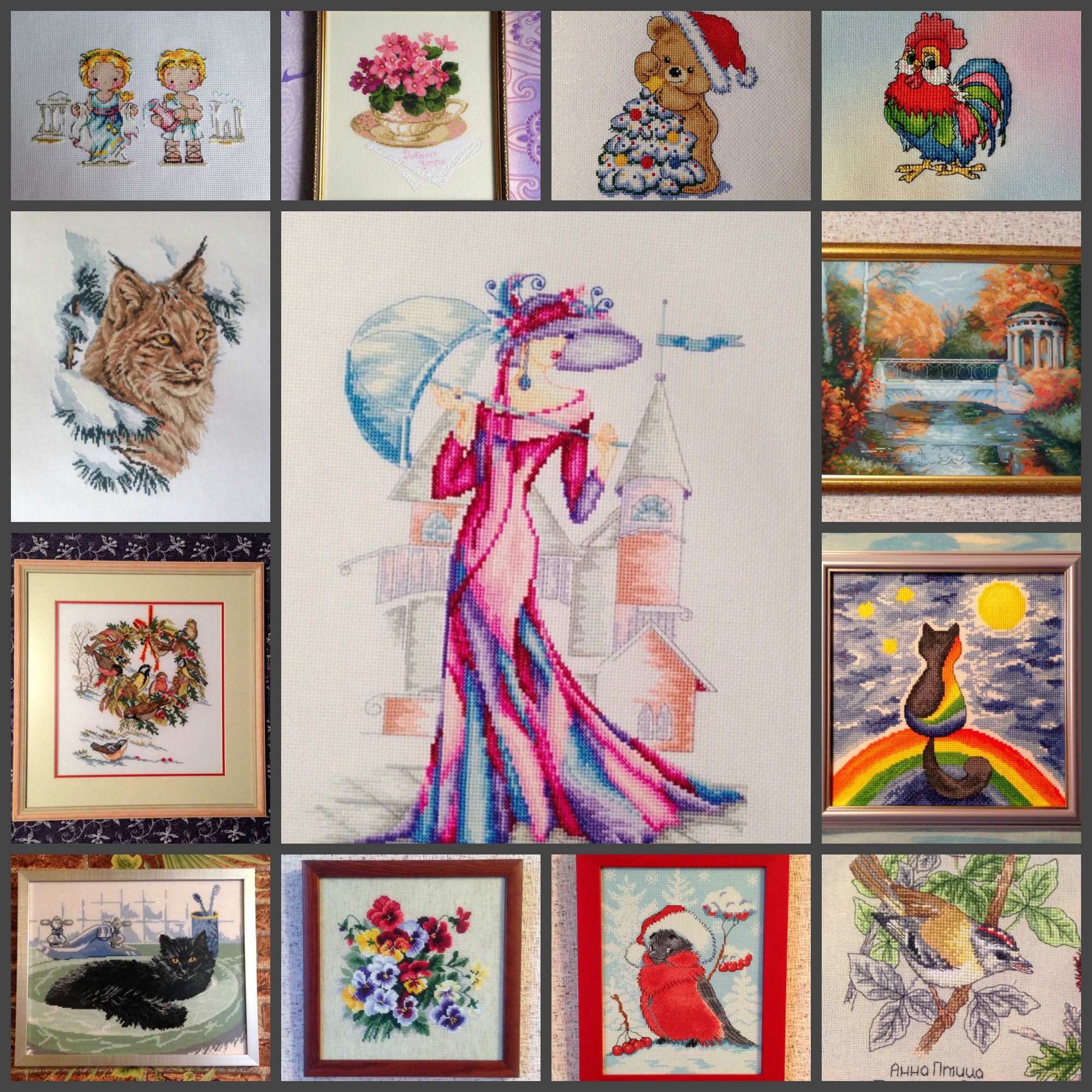 3 декабря 2016 Привет, дорогие мои. Близится к концу год и скоро подводить итоги. Что же имеем на сегодняшний день. Из старых процессов неторопливо подрастает только Кошка Марта, она же Леди Мяу. И начато много новых ))) Have to fun по схеме Екатерины Гафенко. Подарок от Лушеньки. За основу выбрала Murano 32 светло-сиреневый Подушка Терра от Риолис. Самое не любимое в Риолисе, это перемотка ниточек. Но в этом наборе был приятный сюрприз. Ниточки намотаны на органайзер. Ну и какой Новый Год у вышивальщицы без символа года. Традицию я эту стараюсь соблюдать. Однако с обезьяной не получилось. Не встретилась мне достойная обезьяна. К птичкам я отношусь трогательно, но петухов, в частности, не люблю. Но какого-нибудь-то надо вышить, дабы соблюсти традицию. И вот он - очаровашка от Анютки Свист. Думала сначала традиционно взять канву с люрексом. На 14 шить быстро и легко, блестит опять же красиво. Но изучив схему обнаружила там массу четверть крестиков. Вопрос по канве отпал сам сбой. Однозначно надо шить на равномерке. И тут я вспомнила, что канву сейчас красят в любой цвет и даже несколько цветов одновременно. И выбрала для своего петушка радужную окраску. Милая мордашка получилась. Дикая белочка, Yulik, Кисуля и 11 других сказали спасибо Поделиться сообщением Ссылка на сообщение