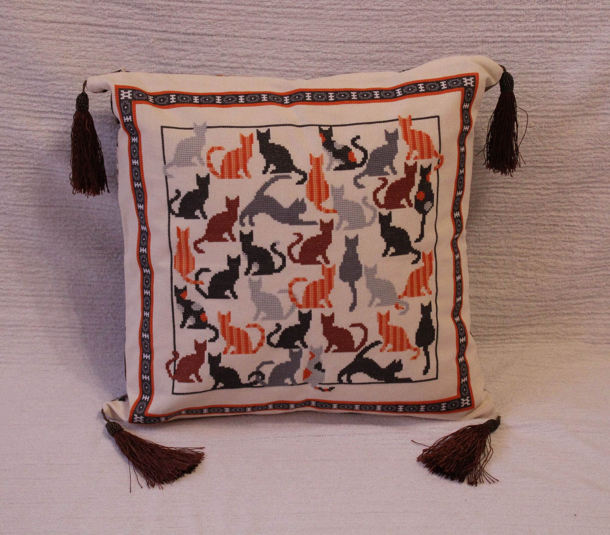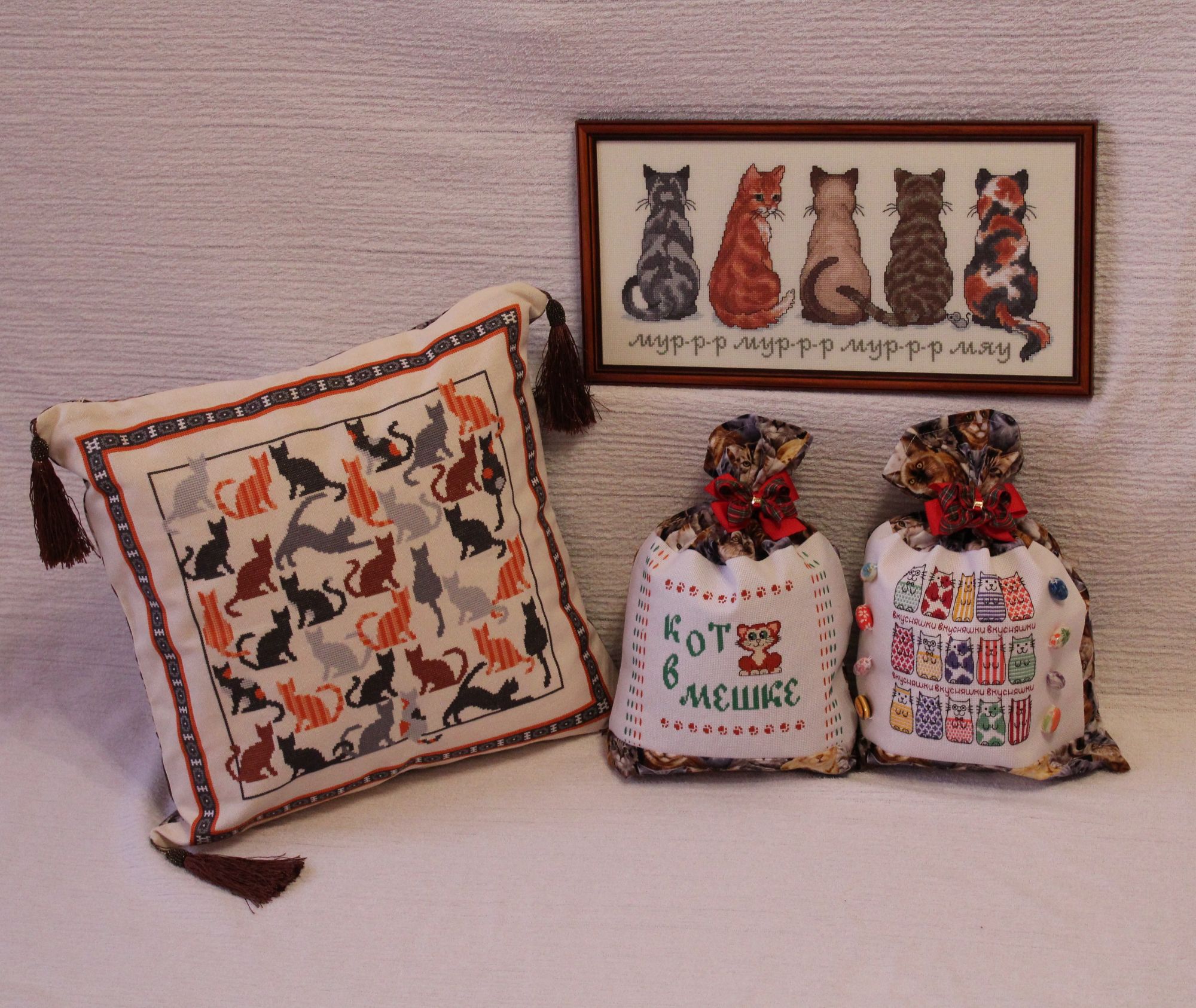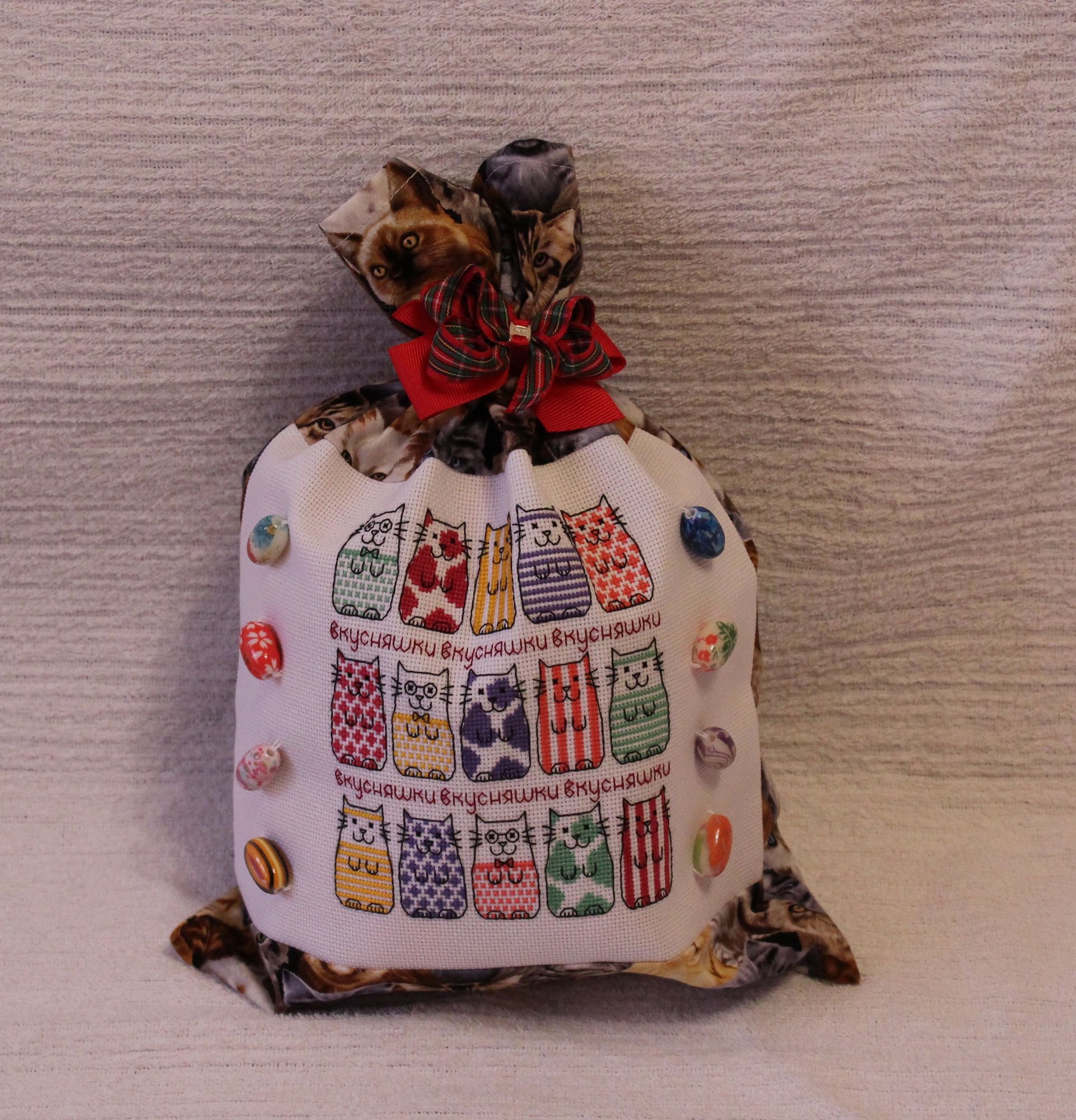 24 июня 2017 Ого, полгода ничего не писала. Надо срочно исправляться. За все это время я только и успела, что в Сюрприз поиграть. И так. Мой сюрприз получен и показан. Теперь можно и мне показать, как же шла подготовка. Татуся предложила мне 3 темы на выбор. Среди которых была моя любимая - кошки. И выбрала я конечно же ее. В качестве центральной части я выбрала сюжет, который давно хотела вышить, да все как-то не срасталось. Пришлось, правда его немножко сократить, ибо в почтовую коробку он целиком не помещался. То, что любимый сюжет с отличными ниточками и канвой доставляет удовольствие, я расписывать не буду. Это и так все знают. Мышка совершенно очаровательна. И впервые я попробовала французский узелок. К этим кошкам отлично подошел еще один нежно любимый мной сюжет-подушка Для задней части подушки нашлась замечательная тканюшка с кошками И еще сшила два мешочка для дополнительных приятностей Вот такой кошачий сюрприз у меня получился. Надеюсь, вам нравится )))) tavenir, Lusha73, Veta и 18 других сказали спасибо Поделиться сообщением Ссылка на сообщение