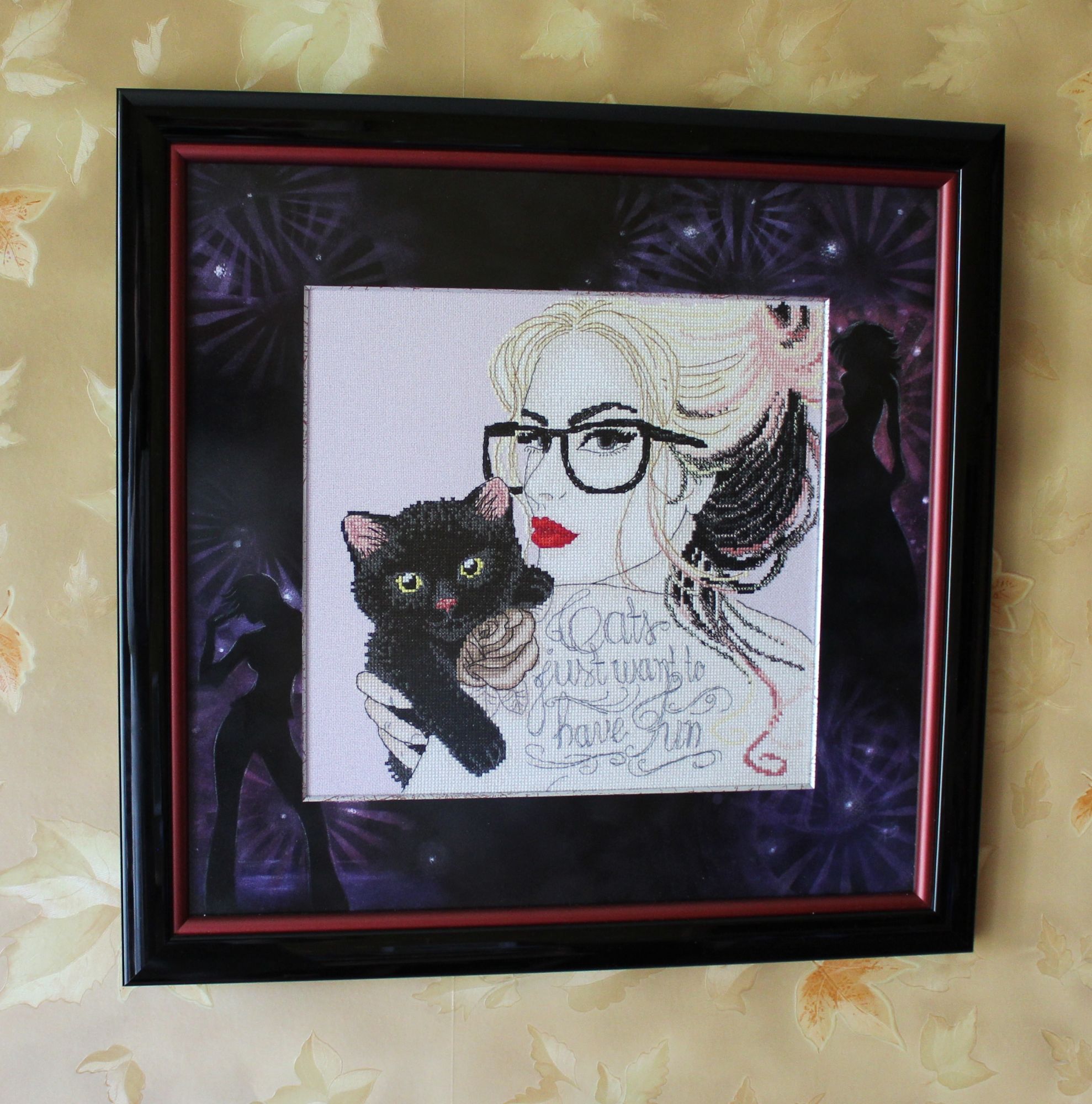 20 мая 2018 Моя девочка оформилась! Двойной глянцевый багет, бархатное паспарту с дорисовкой и серебристый слип. Схема Екатерины Гафенко по иллюстрации Тати Феррино. Схема отлично проработана и вышивать было не сложно. Бэка много, и он совершенно убойный. Но мне даже это понравилось. Интересно и приятно было наблюдать, как проявляется рисунок на невыразительных крестиках. А вот по поводу оформления было много сомнений. В итоге решила поддержать идею и тему художницы. По одной из версий, эта иллюстрация "кошки тоже хотят веселиться" появилась в ответ на то, что в ночные клубы разрешили приходить с маленькими собачками. Именно атмосферу ночного клуба и хотелось передать в оформлении. А воплотила в жизнь мою идею замечательный дизайнер Наталья и оформители багетной мастерской "Палитра". Nat717, kas_julia, irinka-mandarinka и 11 других сказали спасибо Поделиться сообщением Ссылка на сообщение