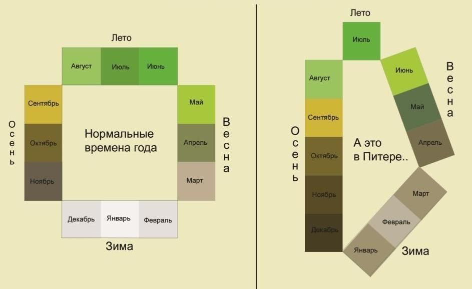 12 августа 2016 24 минуты назад, niksi сказал: о! как раз вспомнила картинку в тему Я так красиво рисовать не умею, у нас в последнее время с октября до середины апреля зима (снег начинается где-то с конца января), потом в апреле температура резко меняется с минуса сразу до +30, и до октября у нас лето, если повезет, то с небольшими передышками на +20, а в октябре хоп! и сразу ноль градусов )) marusya64, Rumba, чеба и 1 другой сказали спасибо Поделиться сообщением Ссылка на сообщение