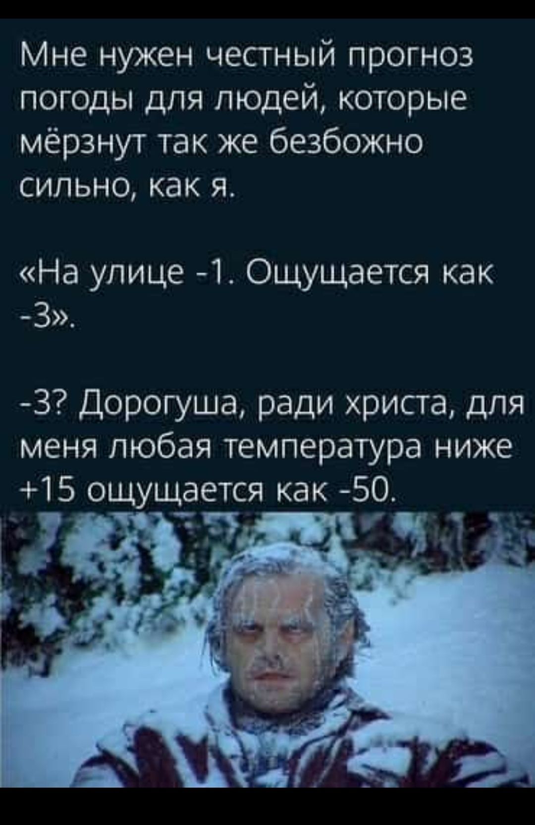12 января 2021 Ой, а нас минус 30 в 7 утра было. Зато посветлело вчера, даже солнце показалось, а сейчас туман морозный. reyjeff, Polly, musya и 5 других сказали спасибо Поделиться сообщением Ссылка на сообщение