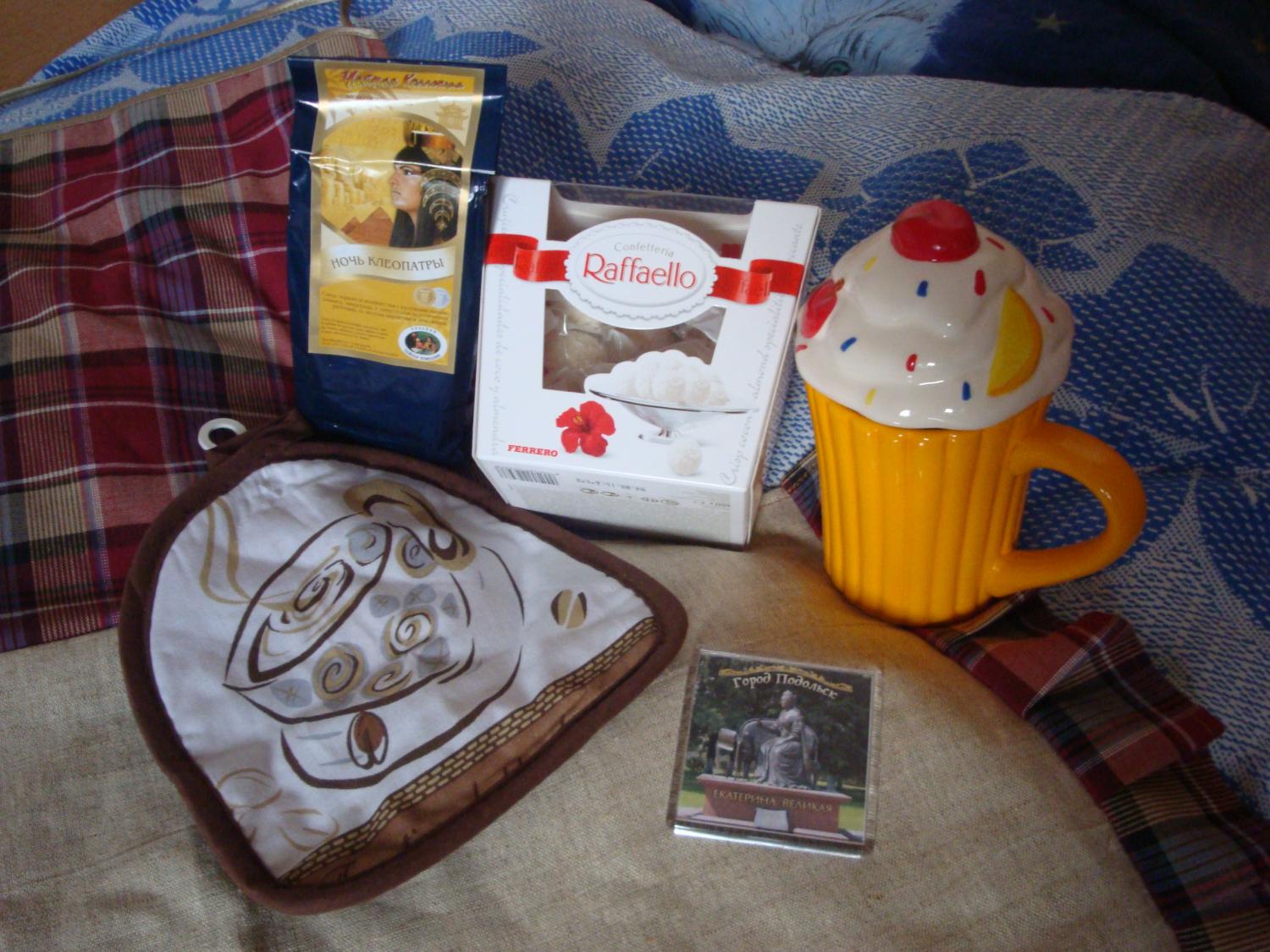 22 сентября 2011 Девочки, вот и у меня праздник Сегодня выгребла из почтового ящика газеты, а вместе с ними и заветное уведомление Пока шла домой с почты пыталась по шуршанию в коробке определить, что там лежит)) Пришел мне сюрприз от Катюши Чивавы Открыла я коробочку, разгребла бумажки упаковочные, а там целый клад! Прежде всего, замечательный фартучек с вышивкой! Очень кстати, учитывая, что больше всего я люблю готовить выпечку, а там мука, тесто... В общем, сюрприз попал в самую точку Еще там был ароматный чай (сегодня же заварю), прихваточка, магнит, который занял почетное место на холодильнике, чашечка (мой любимый цвет, мой любимый размер!), коробка конфет (обожаю рафаэлки!) и, конечно, письмо)) Все вместе. Как аккуратно сшит фартук! Катя, ты настоящая мастерица, мое общение со швейной машинкой обычно происходит редко и заканчивается быстро)) Кармашек поближе В чашечку буду заваривать вкусный чай и наслаждаться им по вечерам, просматривая любимый форум))) Катя, спасибо тебе огромное!)) Сюрприз получился просто замечательный! Чивава сказал(а) спасибо Поделиться сообщением Ссылка на сообщение