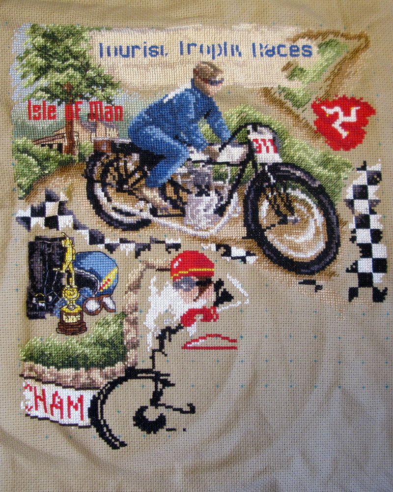18 февраля 2017 В 11.02.2017 at 17:29, titania сказал: Как бэк вещицы оживил. Люблю такие дизайны с разными мелкими детальками. О, да. Только впереди его... я сначала была оптимистичнее в отношении этого бэка. В 11.02.2017 at 19:18, ОльгаВл сказал: Скоро и второй гонщик появится И он тут как тут! Появились и две последние надписи. Ramsey Hairpin и The Bungalow. Вышивала - ломала голову, что же это может быть... Рамси - это город-порт на острове Мэн. А что такое Hairpin - причем тут шпилька для волос? Интернет - великая вещь! Так назывался участок гоночной трассы - Шпилька Рамси. Вторая надпись - слово понятное: The Bungalow. Оказалось тоже просто. Это название отеля - и остановки (конечной) то ли трамвая, то ли местной железной дороги - около него... Тоже место на гоночной трассе! Да, еще прочитала про символ на флаге, три ноги в доспехах из одной точки. Это означало примерно следующее: как бы мы ни упали, мы мгновенно поднимемся из любого положения! АлёNка, titania, Юнона1960 и 4 других сказали спасибо Поделиться сообщением Ссылка на сообщение