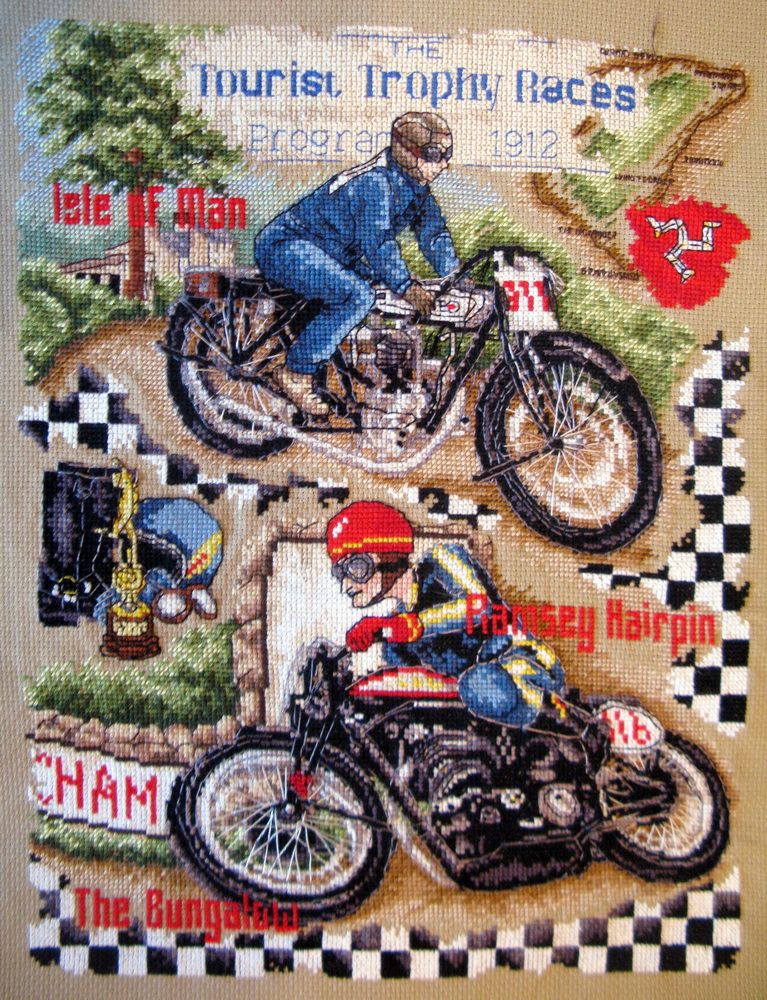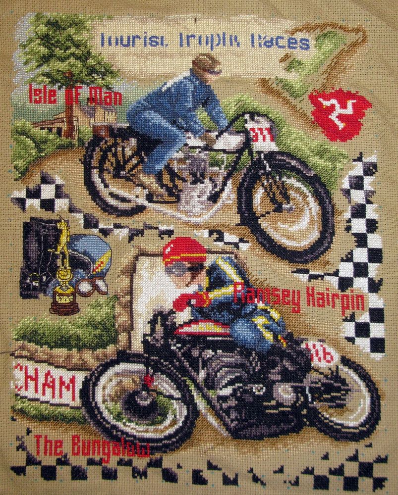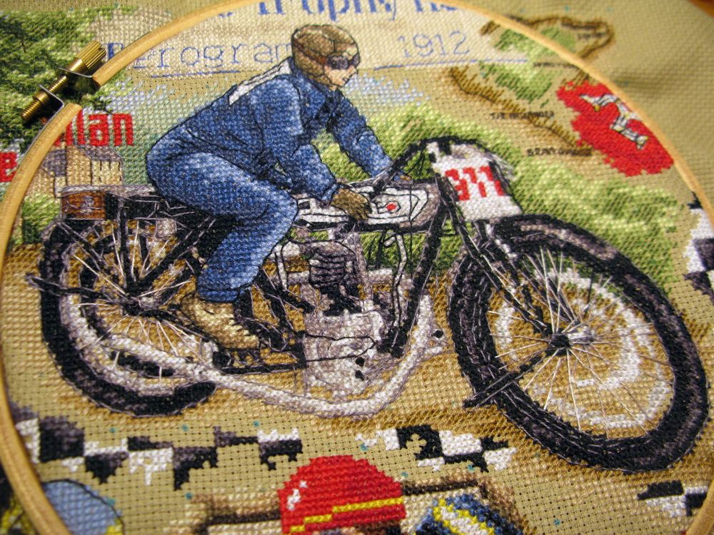 3 марта 2017 О... я начала бэкать. Сначала сделала надпись афиши "The Tourist Trophy Races", это было легко. Тут же голова первого гонщика... Потом пришла очередь карты. На карте названия. Буквы высотой в один крестик, шириной в полкрестика. Каунт 16. Я попадаю иглой в нужные точки. Но нитка-то все равно плохо ложится. Ведь она идет то поверх полного крестика, то по полукресту, то вообще по пустой канве. Короче, ужас... Прочитать названия нельзя, хотя "писала" я их честно, добросовестно, букву за буквой. Скоро переходить к мотоциклам. Колеса - внутри ступицы, спицы... Это еще как-то разбираю, а вот двигатели... прошу прощения заранее, очень сомневаюсь, что получится. Сейчас такая картина: Видимо, все оставшееся время до встречи питерских вышивальщиц я буду бэкать. А так хочется просто КРЕСТИКОВ titania, татьяна0674, Татуся и 11 других сказали спасибо Поделиться сообщением Ссылка на сообщение