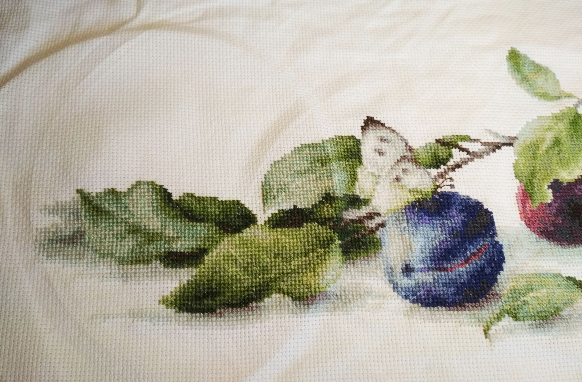 25 сентября 2019 Осталось немного: один листок и одна синяя слива. Единственная трудность для меня была - это схема на восьми листах. Хорошо, что крупная, легко читать. Но вот как расположиться на рабочем месте... И ведь при этом все время стыки, нужен не один лист, а три сразу (мне всегда жалко обрывать ниточку на границе, а вдруг там только один-два крестика остались...). К тому же я шила без разметки, а на переходах никак не дублируются ряды, напряженно было для меня не промахнуться. И еще я впервые столкнулась с таким органайзером для ниток. Долго мучилась, пока не решилась разрезать все картонки на отдельные полоски. Но в целом жалко, хороший процесс заканчивается. ОльгаВл, Сибирская Кошка, mag и 3 других сказали спасибо Поделиться сообщением Ссылка на сообщение