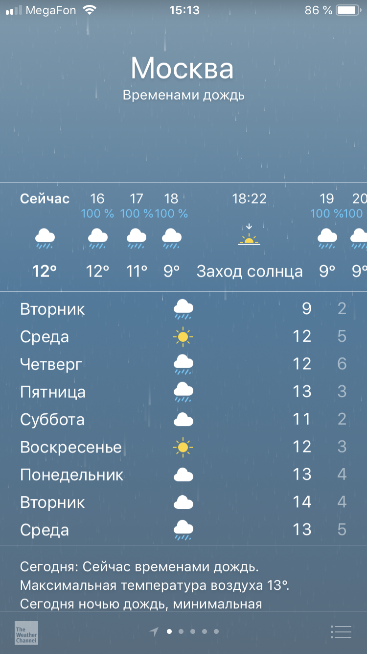 24 сентября 2018 Только что, Nierica сказал: Это что, мне зонтик с собой везти?((( кУпюшон можно Ой, телефон у меня один неплохо погоду показывает, посмотрела- четверг 13 дождь, пятница -16, дождь, суббота-12, дождь, воскресенья пока нет. ААА, собралась ехать в четверг и субботу... yuss, Raduga777 и marvlase сказали спасибо Поделиться сообщением Ссылка на сообщение
