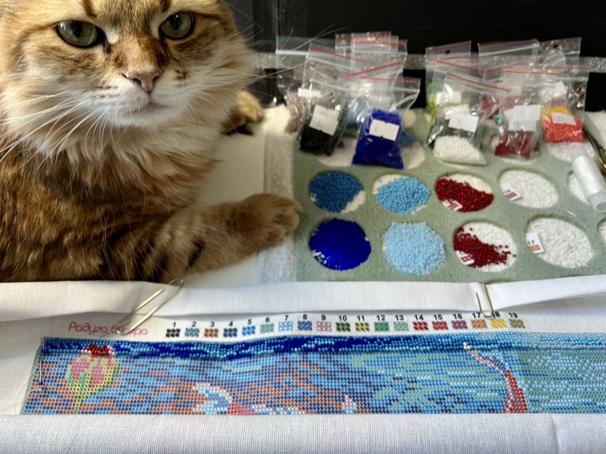 25 октября 2022 Много времени уходит на сборку-разборку бисера по баночкам. Удобнее, конечно, разложенный на отдельном столике бисер, который можно и не убирать. Накрываю салфеткой, чтоб никто не задел, и всё. А котик с детства привычный к бисеру, всегда рядом. Понимает, что нужно бережно относиться к вышивке. Спит рядом пока вышиваю. А ещё оч любит фоткаться)) 19199707770, Vika71, Novia и 8 других сказали спасибо Поделиться сообщением Ссылка на сообщение