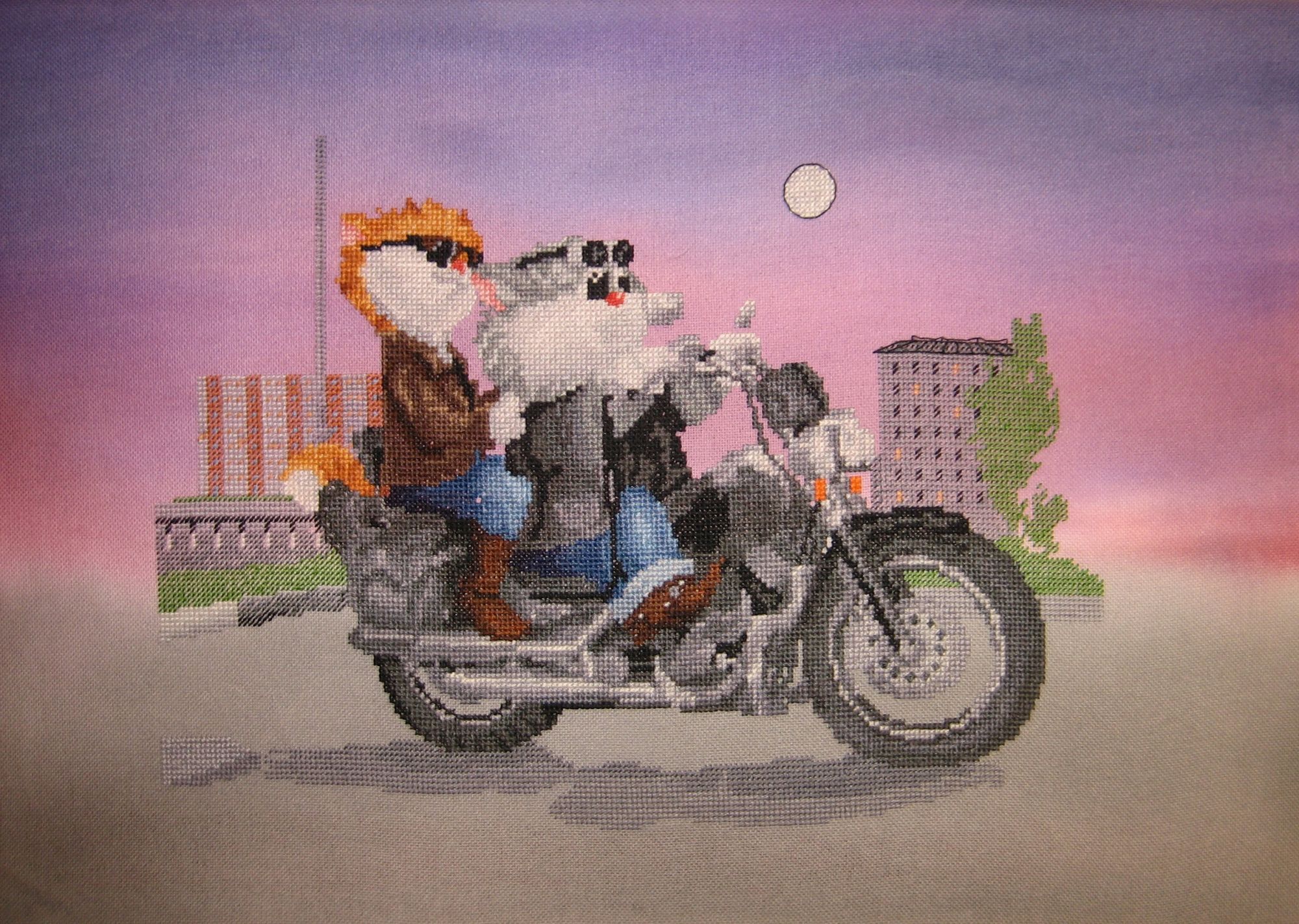 7 мая 2017 Подрос один котик и появился байк)). Вышивать - одно удовольствие, не оторваться, я даже бэк не стала делать сразу - там он несколькими цветами ниток шьётся, в разное количество сложений, что не стала на него отвлекаться. Хотя потом, конечно, это будет, как второй раз вышивать)). Долго вышивалось переднее колесо байка, почти 3 вечера, по 6-7 часов(( На фото не видно, но много смены цветов ниток (как и на всей картинке). Немного тормознула "ювелирная" работа с гайками и болтиками вокруг них - тоже на переднем колесе, которые вышиваются крестиками, вернее, по два 3/4 крестика в одной клеточке. И все клеточки, которые вокруг этой "центральной", тоже вышиваются как 3/4+3/4. Потом поверх ещё бэк пойдёт, но уже сейчас видно, что это болты, так они выделяются)). Killwale, KapRia, ЛюдмилаЕр и 12 других сказали спасибо Поделиться сообщением Ссылка на сообщение