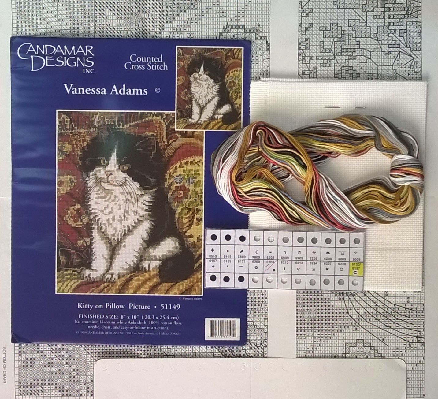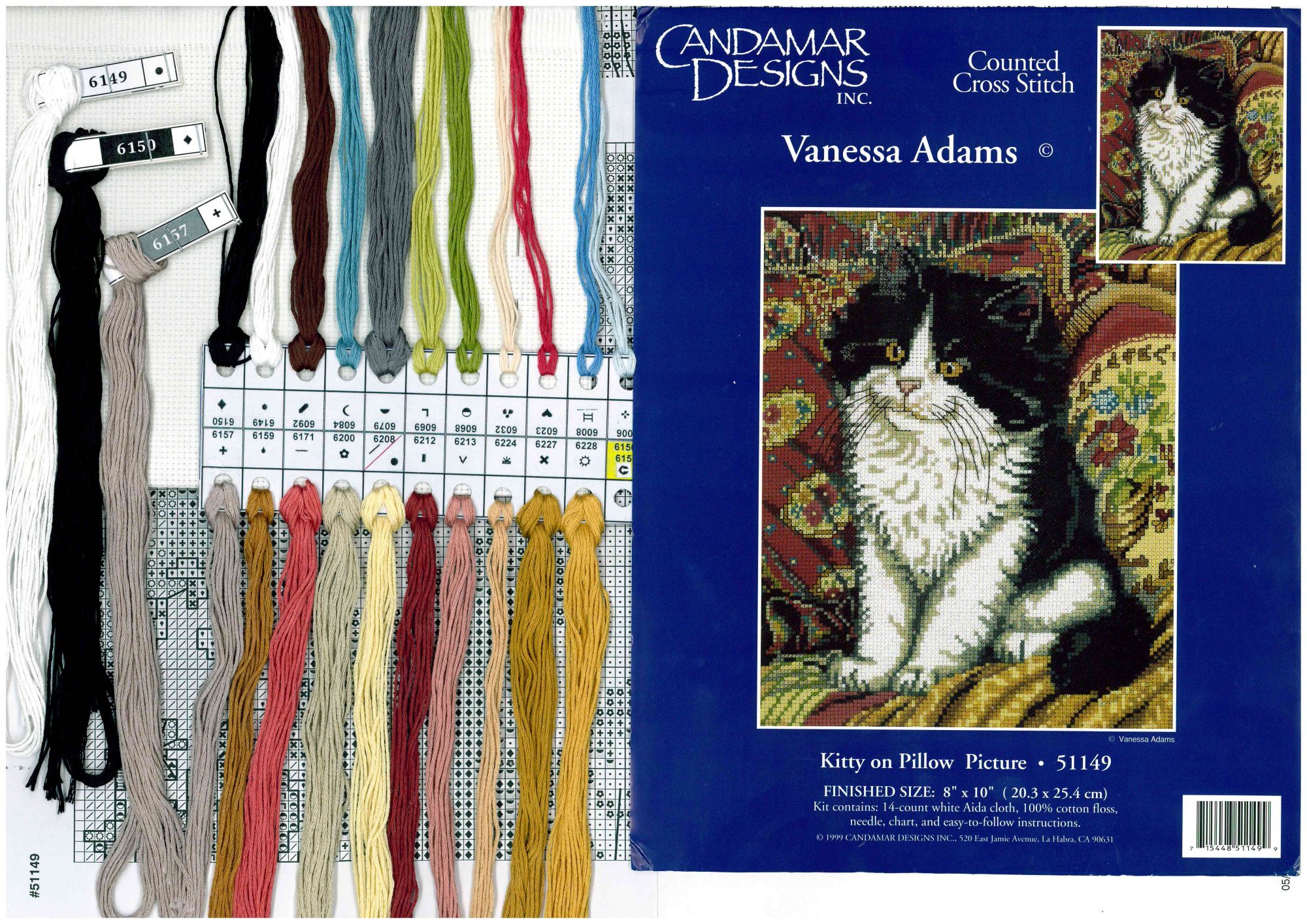 14 января 2019 21 час назад, Alena Lanscowa сказал: Девочки, всем привет от меня и маленького котёнка Показать содержимое Была у нас когда-то любимица Василиса, появилась в нашей семье в 1994 году и прожила 15 лет. Но сначала она 2,5 года была Васькой, а потом случилось чудесное "пополнение в семействе"))) Жалко, что тогда мы очень мало фотографировали, но мы её и так помним и до сих пор вспоминаем.. Candamar 51149. Cat and Floral Wallpaper. Счётный крест. Дизайнер Vanessa Adams по мотивам работы художницы Diane Brakefield "Black&White Kitten". Дизайн - 05.05.1999 112 х 140. 20,3 х 25,4 см. Ключ из 22 символов (21 моно и 1 бленд). Вышивка в 2 нити, счётный крест, бэкстич в 1 и 2 нити разных цветов, коучинг (выкладная нить), французские узелки. Канва Aida ct 14, белая. Мулине Candamar, не разобраны. Органайзер из очень тонкого картона, без символов. Схема крупная, чёрно-белая на 2-х листах А3. Игла. Инструкция на обороте схемы на английском языке. Мулине в наборе не такие яркие, как на обложке, точнее сказать - цвета яркие но матовые. Чёрные нитки очень тонкие. Вложенным планшеткой-органайзером я не пользовалась, сделала свой. Некоторые цвета мулине были в нарезке по 1 м, некоторые по 2 м, 1 или неск. цветов (уже не помню) были целым пучком, 6 или 8 м. Впервые столкнулась с рекомендациями по вышивке всех швов. Т.к. схемы вся ч/б, то и бэе прорисован ч/б. Зато в инструкции - диво, очень занимально было подбирать нитки для бэка на подлоконтике кресла: Показать содержимое Это текст в инструкции: Begin stitching in the center of the design. Follow the arrows at the edges of the chart to find the center (see "Before Stitching") Work all cross stitches first, matching symbols to the color list for proper color placement. Backstitching is indicated by bold lines on chart.Vy Dk Brown #6092 (1 ply) - define all not specified. Pink #6213 (2 ply) - accent couch armrest edge. Yellow-Green #6068 (1 ply) define edgess of green leaves on armrest. Black #6150 (1 ply) - define kitty's eyes. Straight stitches are indicated by bold lines on chart. Vy Dk Brown #6092 (1 ply) - accent couch behind kitty's head and flower petals on armrest. Vy lt Gold #6224 (1 ply) - define stems of brown leaf design on armrest. Yellow-Green #6068 (1 ply) - define stems of green leaves on armrest. Couching stitches are indicated by bold lines on chart. Vy Dk Brown #6092 (1 ply) - define kitty's whisker's. French stitches are indicated by bold * symbols on chart. Yellow #6028 (2 ply-wrap 2) accent flowers on design. А это "вольный" гугл- перевод, редактировать не буду, и так всё понятно: Начните шить в центре дизайна. Следуйте за стрелками по краям диаграммы, чтобы найти центр (см. «Перед сшивкой») Сначала обработайте все крестики, подбирая символы к списку цветов для правильного размещения цветов. Выступы отмечены жирными линиями на графике.Vy Dk Brown # 6092 (1 слой) - определить все не указано. Розовый # 6213 (2 слоя) - акцент дивана подлокотника края. Желто-зеленый # 6068 (1 слой) определяет края зеленых листьев на подлокотнике. Чёрный # 6150 (1 слой) - определите глаза котёнка. Прямые строчки обозначены жирными линиями на графике. Vy Dk Brown # 6092 (1 слой) - акцентная кушетка за головой котенка и лепестки цветов на подлокотнике. Vy lt Gold # 6224 (1 слой) - определить стебли коричневого листа на подлокотнике. Желто-зеленый # 6068 (1 слой) - определить стебли зеленых листьев на подлокотнике. Коучинговые швы обозначены жирными линиями на графике. Vy Dk Brown # 6092 (1 слой) - определить усы котенка. Французские швы обозначены жирным шрифтом * на графике. Желтые # 6028 (2 сгиба 2) акцентные цветы по дизайну. Ни знанию языка, ни логике моей не понятно было только то, что я выделила здесь красным, поэтому ориентировалась на обложку набора)) Котёнок со мной путешествовал везде, вышивала иногда на работе, в дороге, поэтому так долго. Дома дошивала совсем немного, правый нижний угол и почти 3 суток бэк
