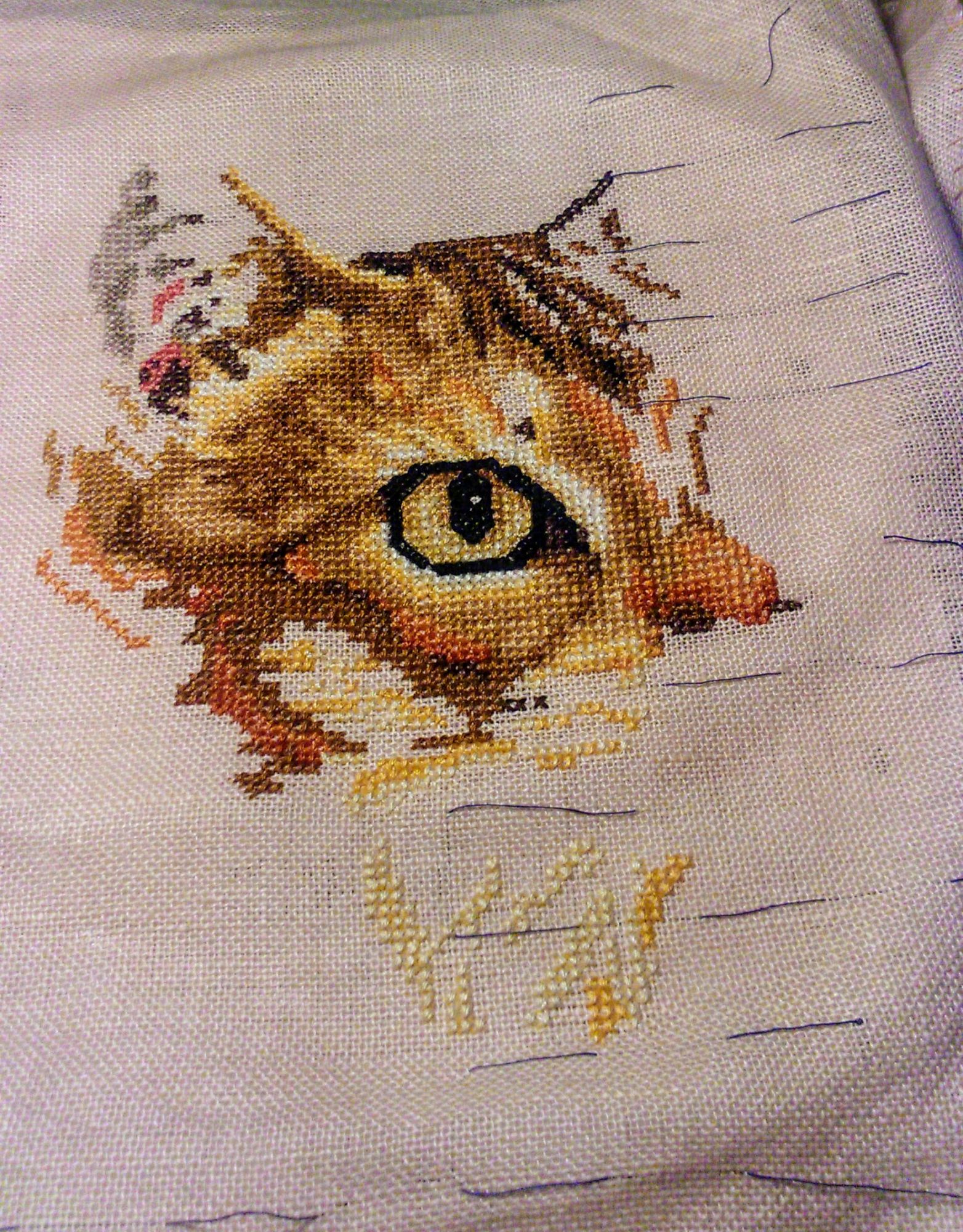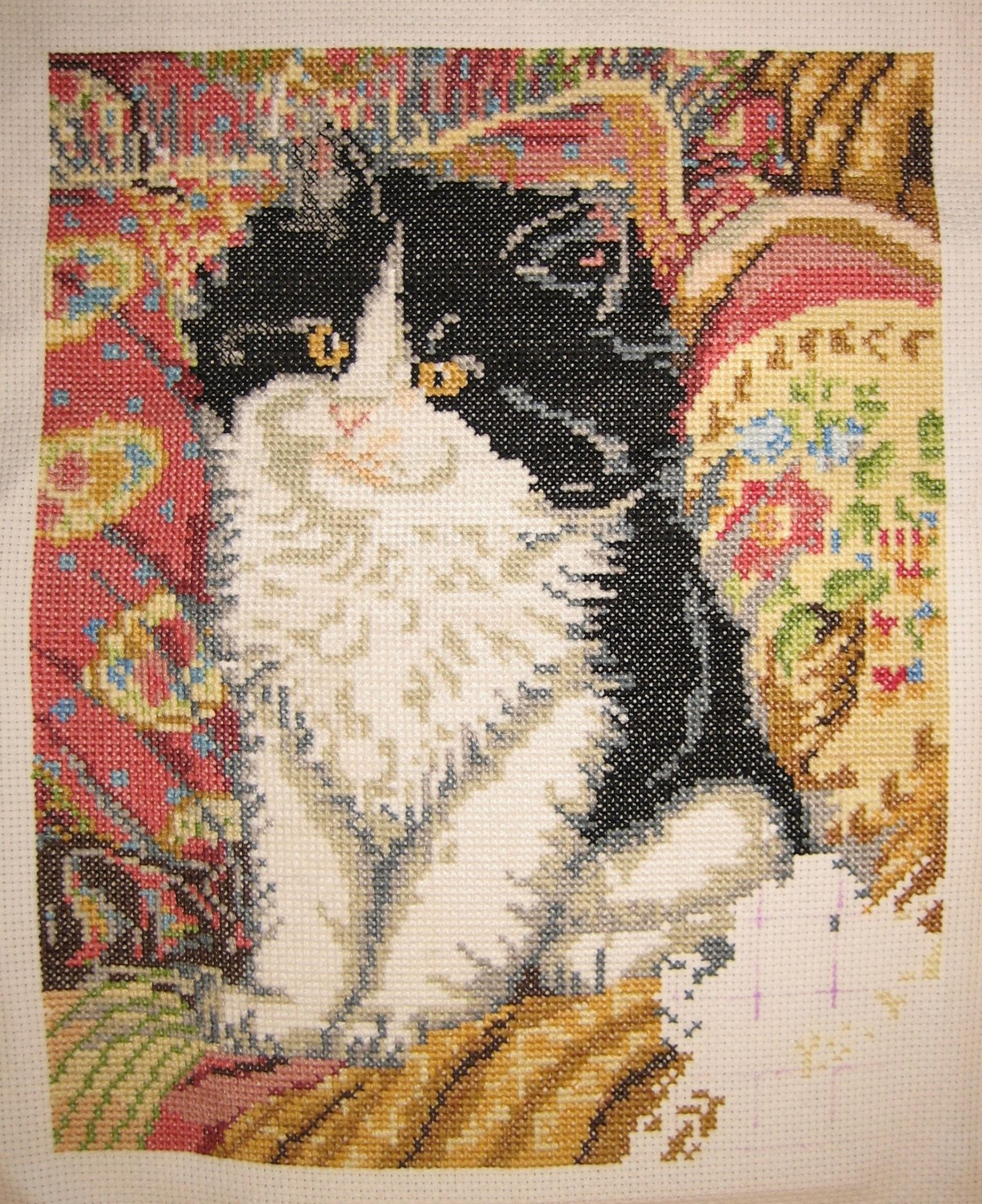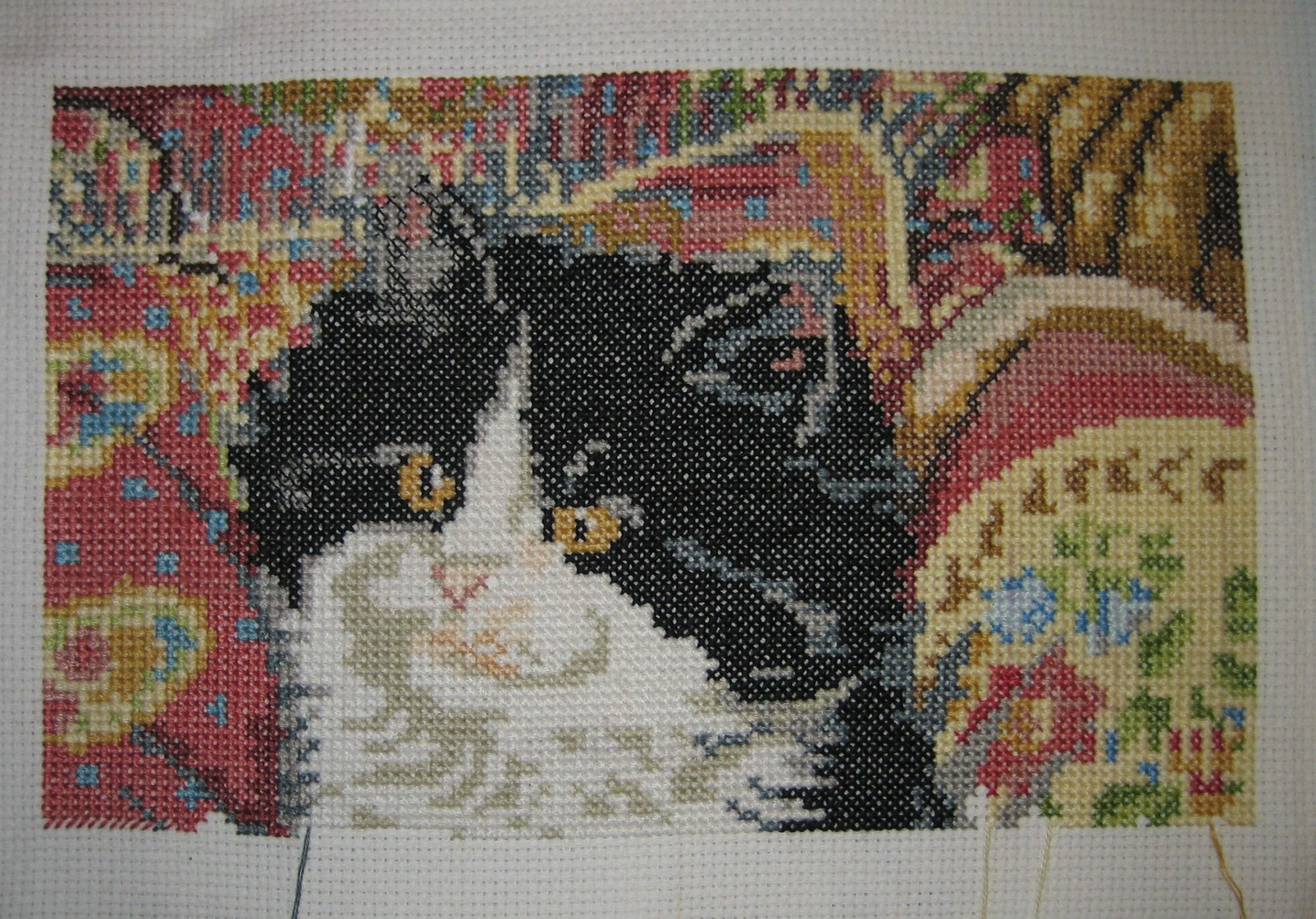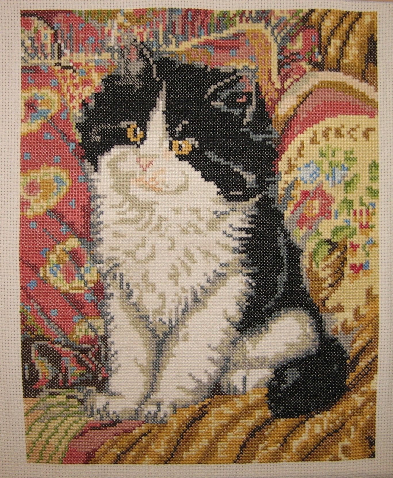 13 января 2019 Девочки, всем привет от меня и маленького котёнка Скрытый текст Была у нас когда-то любимица Василиса, появилась в нашей семье в 1994 году и прожила 15 лет. Но сначала она 2,5 года была Васькой, а потом случилось чудесное "пополнение в семействе"))) Жалко, что тогда мы очень мало фотографировали, но мы её и так помним и до сих пор вспоминаем.. Candamar 51149. Cat and Floral Wallpaper. Счётный крест. Дизайнер Vanessa Adams по мотивам работы художницы Diane Brakefield "Black&White Kitten". Дизайн - 05.05.1999 112 х 140. 20,3 х 25,4 см. Ключ из 22 символов (21 моно и 1 бленд). Вышивка в 2 нити, счётный крест, бэкстич в 1 и 2 нити разных цветов, коучинг (выкладная нить), французские узелки. Канва Aida ct 14, белая. Мулине Candamar, не разобраны. Органайзер из очень тонкого картона, без символов. Схема крупная, чёрно-белая на 2-х листах А3. Игла. Инструкция на обороте схемы на английском языке. Мулине в наборе не такие яркие, как на обложке, точнее сказать - цвета яркие но матовые. Чёрные нитки очень тонкие. Вложенным планшеткой-органайзером я не пользовалась, сделала свой. Некоторые цвета мулине были в нарезке по 1 м, некоторые по 2 м, 1 или неск. цветов (уже не помню) были целым пучком, 6 или 8 м. Впервые столкнулась с рекомендациями по вышивке всех швов. Т.к. схемы вся ч/б, то и бэе прорисован ч/б. Зато в инструкции - диво, очень занимально было подбирать нитки для бэка на подлоконтике кресла: Скрытый текст Это текст в инструкции: Begin stitching in the center of the design. Follow the arrows at the edges of the chart to find the center (see "Before Stitching") Work all cross stitches first, matching symbols to the color list for proper color placement. Backstitching is indicated by bold lines on chart.Vy Dk Brown #6092 (1 ply) - define all not specified. Pink #6213 (2 ply) - accent couch armrest edge. Yellow-Green #6068 (1 ply) define edgess of green leaves on armrest. Black #6150 (1 ply) - define kitty's eyes. Straight stitches are indicated by bold lines on chart. Vy Dk Brown #6092 (1 ply) - accent couch behind kitty's head and flower petals on armrest. Vy lt Gold #6224 (1 ply) - define stems of brown leaf design on armrest. Yellow-Green #6068 (1 ply) - define stems of green leaves on armrest. Couching stitches are indicated by bold lines on chart. Vy Dk Brown #6092 (1 ply) - define kitty's whisker's. French stitches are indicated by bold * symbols on chart. Yellow #6028 (2 ply-wrap 2) accent flowers on design. А это "вольный" гугл- перевод, редактировать не буду, и так всё понятно: Начните шить в центре дизайна. Следуйте за стрелками по краям диаграммы, чтобы найти центр (см. «Перед сшивкой») Сначала обработайте все крестики, подбирая символы к списку цветов для правильного размещения цветов. Выступы отмечены жирными линиями на графике.Vy Dk Brown # 6092 (1 слой) - определить все не указано. Розовый # 6213 (2 слоя) - акцент дивана подлокотника края. Желто-зеленый # 6068 (1 слой) определяет края зеленых листьев на подлокотнике. Чёрный # 6150 (1 слой) - определите глаза котёнка. Прямые строчки обозначены жирными линиями на графике. Vy Dk Brown # 6092 (1 слой) - акцентная кушетка за головой котенка и лепестки цветов на подлокотнике. Vy lt Gold # 6224 (1 слой) - определить стебли коричневого листа на подлокотнике. Желто-зеленый # 6068 (1 слой) - определить стебли зеленых листьев на подлокотнике. Коучинговые швы обозначены жирными линиями на графике. Vy Dk Brown # 6092 (1 слой) - определить усы котенка. Французские швы обозначены жирным шрифтом * на графике. Желтые # 6028 (2 сгиба 2) акцентные цветы по дизайну. Ни знанию языка, ни логике моей не понятно было только то, что я выделила здесь красным, поэтому ориентировалась на обложку набора)) Котёнок со мной путешествовал везде, вышивала иногда на работе, в дороге, поэтому так долго. Дома дошивала совсем немного, правый нижний угол и почти 3 суток бэк и прочие "прелести".. Стирала от души, рук