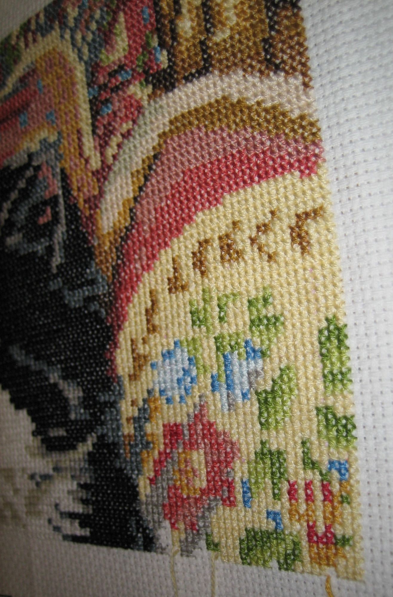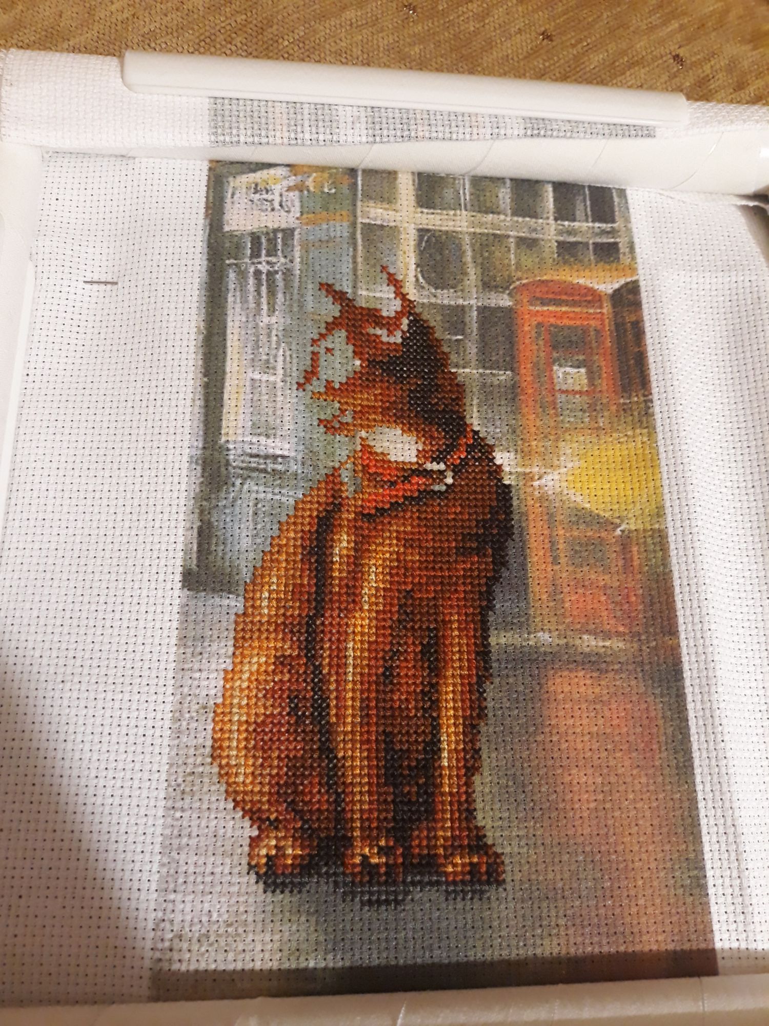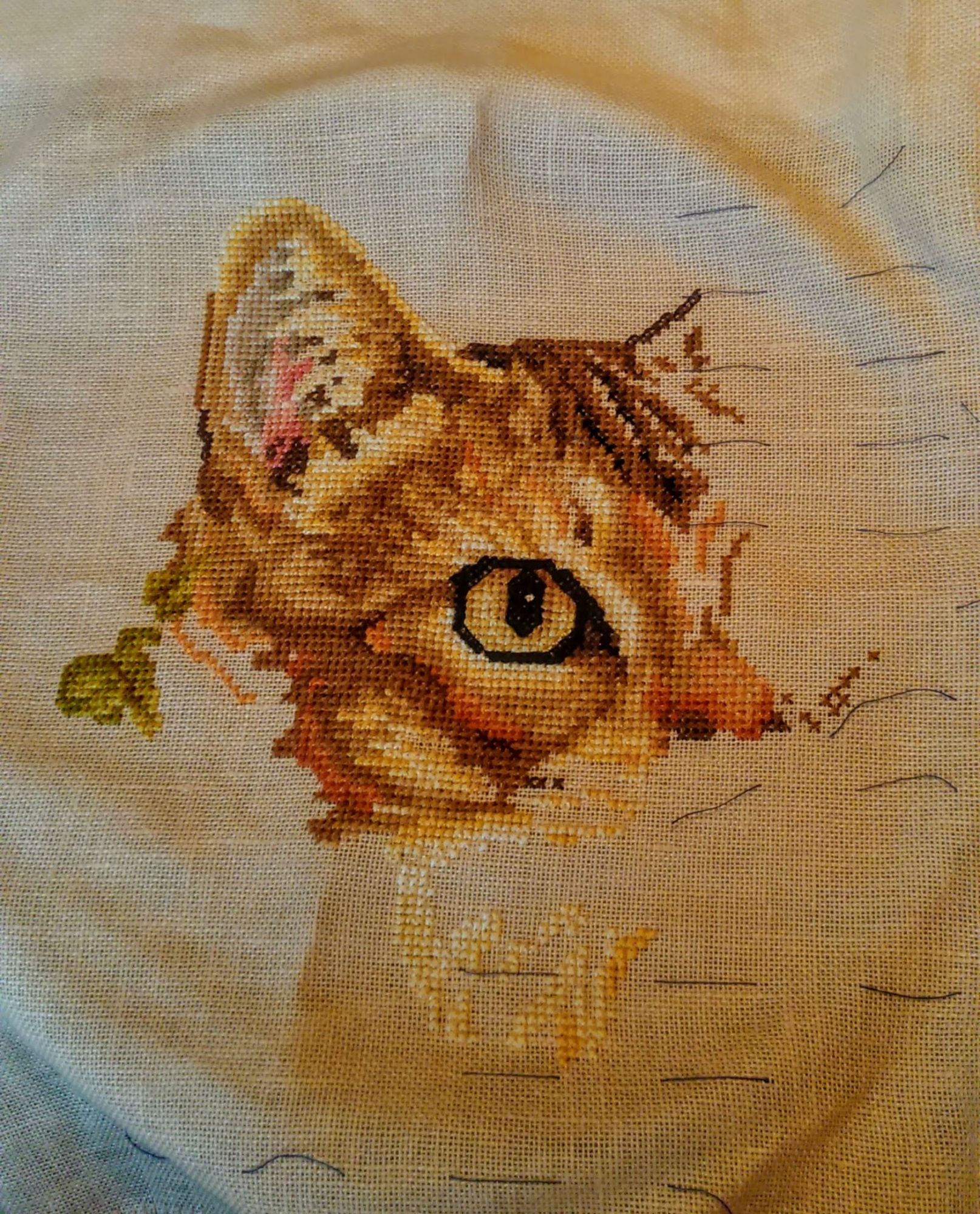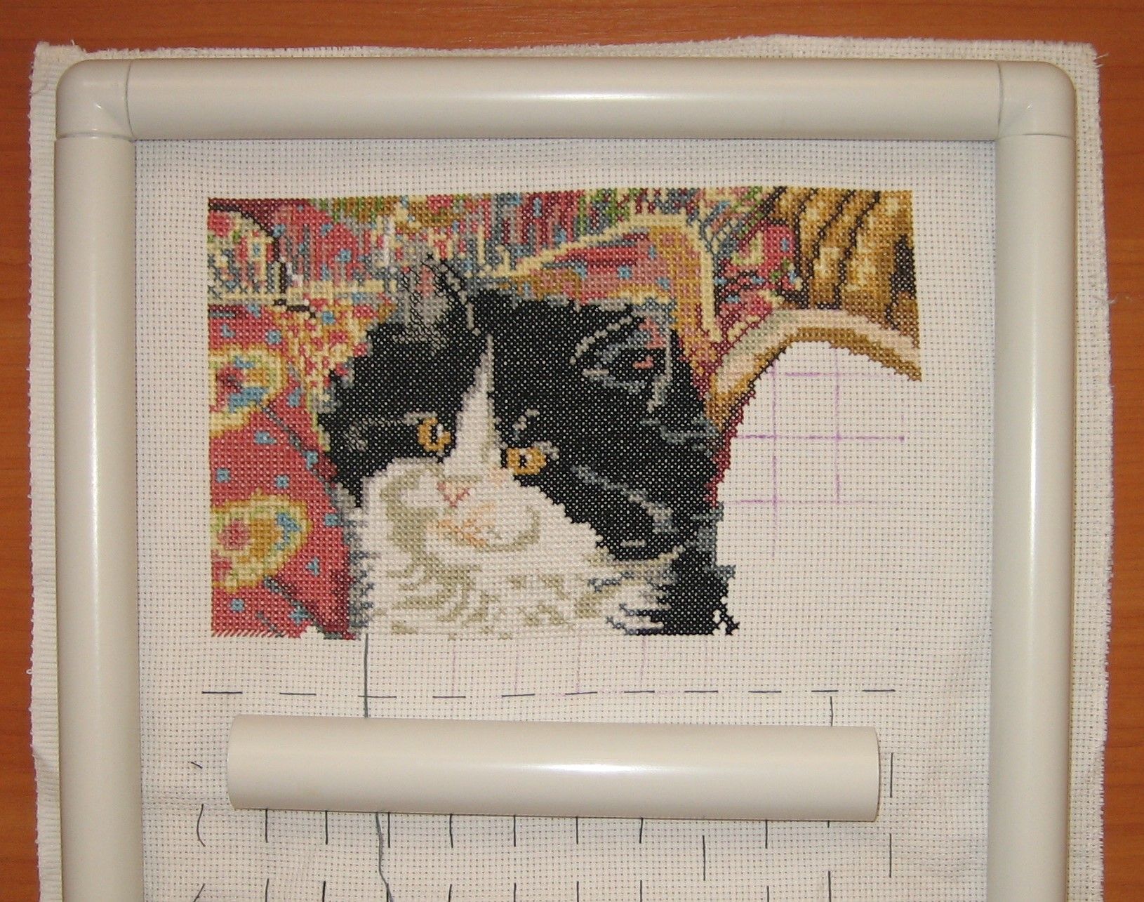 13 января 2019 Девочки, всем привет от меня и маленького котёнка Скрытый текст Была у нас когда-то любимица Василиса, появилась в нашей семье в 1994 году и прожила 15 лет. Но сначала она 2,5 года была Васькой, а потом случилось чудесное "пополнение в семействе"))) Жалко, что тогда мы очень мало фотографировали, но мы её и так помним и до сих пор вспоминаем.. Candamar 51149. Cat and Floral Wallpaper. Счётный крест. Дизайнер Vanessa Adams по мотивам работы художницы Diane Brakefield "Black&White Kitten". Дизайн - 05.05.1999 112 х 140. 20,3 х 25,4 см. Ключ из 22 символов (21 моно и 1 бленд). Вышивка в 2 нити, счётный крест, бэкстич в 1 и 2 нити разных цветов, коучинг (выкладная нить), французские узелки. Канва Aida ct 14, белая. Мулине Candamar, не разобраны. Органайзер из очень тонкого картона, без символов. Схема крупная, чёрно-белая на 2-х листах А3. Игла. Инструкция на обороте схемы на английском языке. Мулине в наборе не такие яркие, как на обложке, точнее сказать - цвета яркие но матовые. Чёрные нитки очень тонкие. Вложенным планшеткой-органайзером я не пользовалась, сделала свой. Некоторые цвета мулине были в нарезке по 1 м, некоторые по 2 м, 1 или неск. цветов (уже не помню) были целым пучком, 6 или 8 м. Впервые столкнулась с рекомендациями по вышивке всех швов. Т.к. схемы вся ч/б, то и бэе прорисован ч/б. Зато в инструкции - диво, очень занимально было подбирать нитки для бэка на подлоконтике кресла: Скрытый текст Это текст в инструкции: Begin stitching in the center of the design. Follow the arrows at the edges of the chart to find the center (see "Before Stitching") Work all cross stitches first, matching symbols to the color list for proper color placement. Backstitching is indicated by bold lines on chart.Vy Dk Brown #6092 (1 ply) - define all not specified. Pink #6213 (2 ply) - accent couch armrest edge. Yellow-Green #6068 (1 ply) define edgess of green leaves on armrest. Black #6150 (1 ply) - define kitty's eyes. Straight stitches are indicated by bold lines on chart. Vy Dk Brown #6092 (1 ply) - accent couch behind kitty's head and flower petals on armrest. Vy lt Gold #6224 (1 ply) - define stems of brown leaf design on armrest. Yellow-Green #6068 (1 ply) - define stems of green leaves on armrest. Couching stitches are indicated by bold lines on chart. Vy Dk Brown #6092 (1 ply) - define kitty's whisker's. French stitches are indicated by bold * symbols on chart. Yellow #6028 (2 ply-wrap 2) accent flowers on design. А это "вольный" гугл- перевод, редактировать не буду, и так всё понятно: Начните шить в центре дизайна. Следуйте за стрелками по краям диаграммы, чтобы найти центр (см. «Перед сшивкой») Сначала обработайте все крестики, подбирая символы к списку цветов для правильного размещения цветов. Выступы отмечены жирными линиями на графике.Vy Dk Brown # 6092 (1 слой) - определить все не указано. Розовый # 6213 (2 слоя) - акцент дивана подлокотника края. Желто-зеленый # 6068 (1 слой) определяет края зеленых листьев на подлокотнике. Чёрный # 6150 (1 слой) - определите глаза котёнка. Прямые строчки обозначены жирными линиями на графике. Vy Dk Brown # 6092 (1 слой) - акцентная кушетка за головой котенка и лепестки цветов на подлокотнике. Vy lt Gold # 6224 (1 слой) - определить стебли коричневого листа на подлокотнике. Желто-зеленый # 6068 (1 слой) - определить стебли зеленых листьев на подлокотнике. Коучинговые швы обозначены жирными линиями на графике. Vy Dk Brown # 6092 (1 слой) - определить усы котенка. Французские швы обозначены жирным шрифтом * на графике. Желтые # 6028 (2 сгиба 2) акцентные цветы по дизайну. Ни знанию языка, ни логике моей не понятно было только то, что я выделила здесь красным, поэтому ориентировалась на обложку набора)) Котёнок со мной путешествовал везде, вышивала иногда на работе, в дороге, поэтому так долго. Дома дошивала совсем немного, правый нижний угол и почти 3 суток бэк и прочие "прелести".. Стирала от души, рук