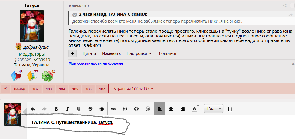 27 февраля 2016 Татуся, огромное спасибо , что бы мы без тебя делали В 18.02.2016 at 22:30, Татуся сказал: Галочка, перечислять ники теперь стало проще простого, кликаешь на "тучки" возле ников тех пользователей, которых хочешь вставить в сообщение, она справа от ника (она невидима, но если на нее навести, она появляется) и ники выстраиваются в одно новое сообщение внизу темы все вместе) потом дописываешь текст в этом сообщении какой тебе надо и отправляешь ответ "в эфир") Татуся сказал(а) спасибо Поделиться сообщением Ссылка на сообщение
