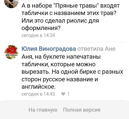 13 февраля 2018 5 часов назад, TanitaK сказал: А мне интересно, в Пряных травах ярлычки в комплекте будут? Сама так красиво я никогда не напишу Мне кажется, что на картинке они фотошопом добавлены)) Так как собираюсь купить этот набор, смотрела на сайте производителя. О дополнительных элементах в наборе информации нет. Обычно под описанием набора есть такая информация, например, "в набор входит подкладка, наполнитель". Но могли и забыть добавить описание. Знаю, "Риолис" есть в соцсетях, но меня там нет. Если есть возможность, уточните этот момент в группе и сообщите результат. Gingery сказал(а) спасибо Поделиться сообщением Ссылка на сообщение