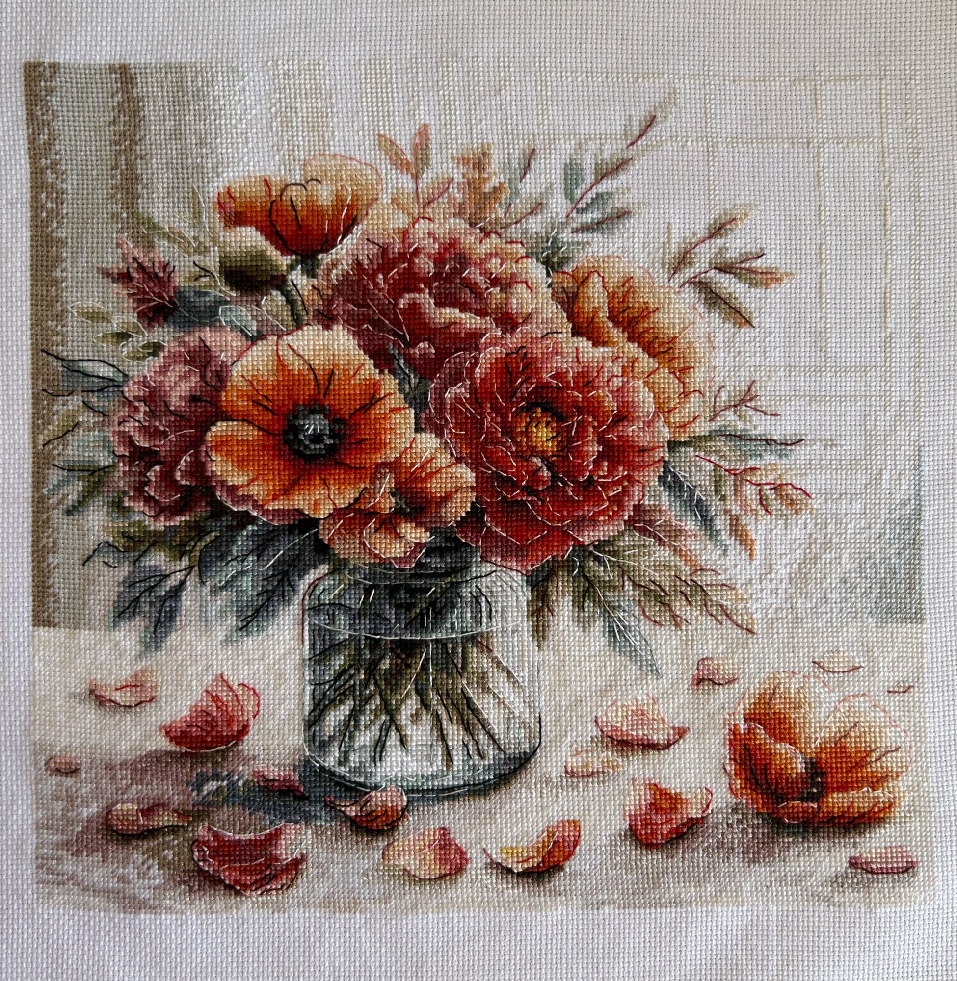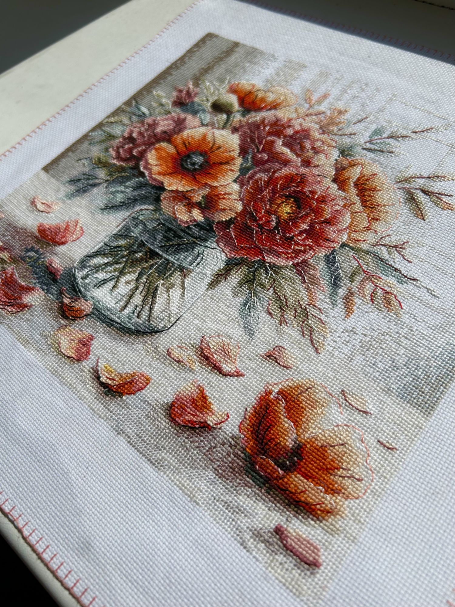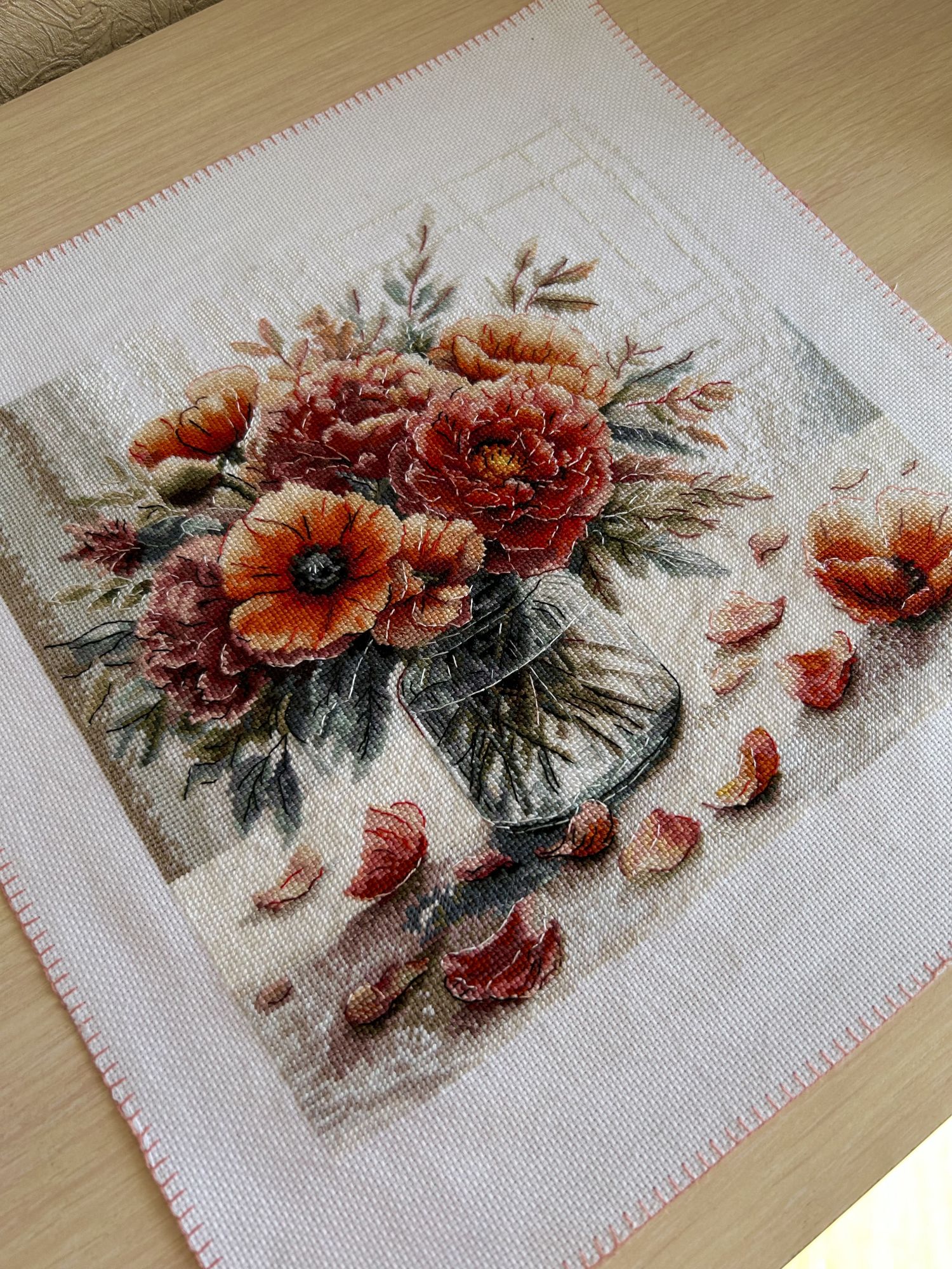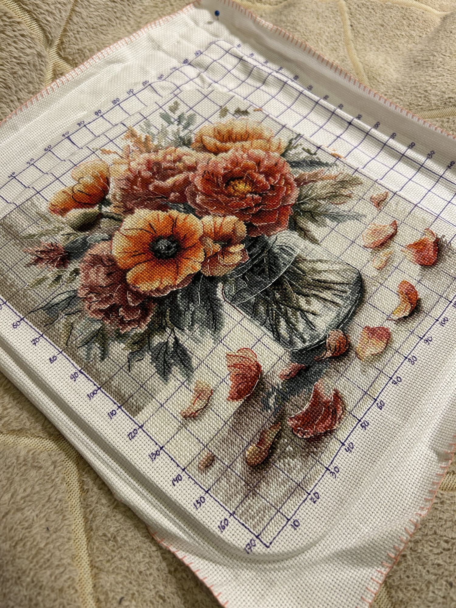 20 августа Букет в вазе от Альбины Серебрянской готов вышивала на 18 аиде нитками DMC (подавляющее большинство) и СХС несколько цветов. Этот букет нужно вышивать на 14 аиде, тогда работа будет воздушнее и прозрачнее в духе Lanarte, как и задумывал дизайнер схемы. На 18 аиде работа получилась сочнее, но потеряла часть воздушности. Проработка понравилась несмотря на «50 оттенков белого и молочного», яркость цветов красного и оранжевого компенсировала молочно-серую гамму. relax_cross_stitch, Забава_, mechtatel_arh и 5 других сказали спасибо Поделиться сообщением Ссылка на сообщение
